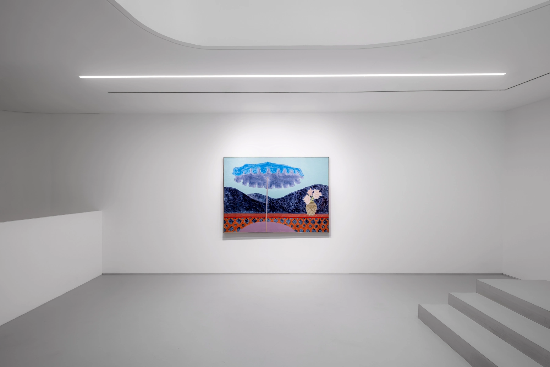 Based in Greenwich Village, the Avery family packed their easels over the summer months which they preferred spent in nature – from Vermont to Massachusetts, from Canada to Europe. While Avery is known to incorporate snapshots into the preliminary drawings from which she composes her paintings, Terrace Umbrella (1990) represents a timeless, inexhaustible moment hovering in-between serenity and recreation. The painting likely depicts the view from the terrace of the Avery family home in Bargemon, France. Executed in oil on canvas, the composition brings together soft rose, emerald, and vermillion shades with and a near-black-purple and a crisp sky blue; it vividly testifies to the artist’s sophisticated use of color in rendering terrestrial formations in an otherworldly light.