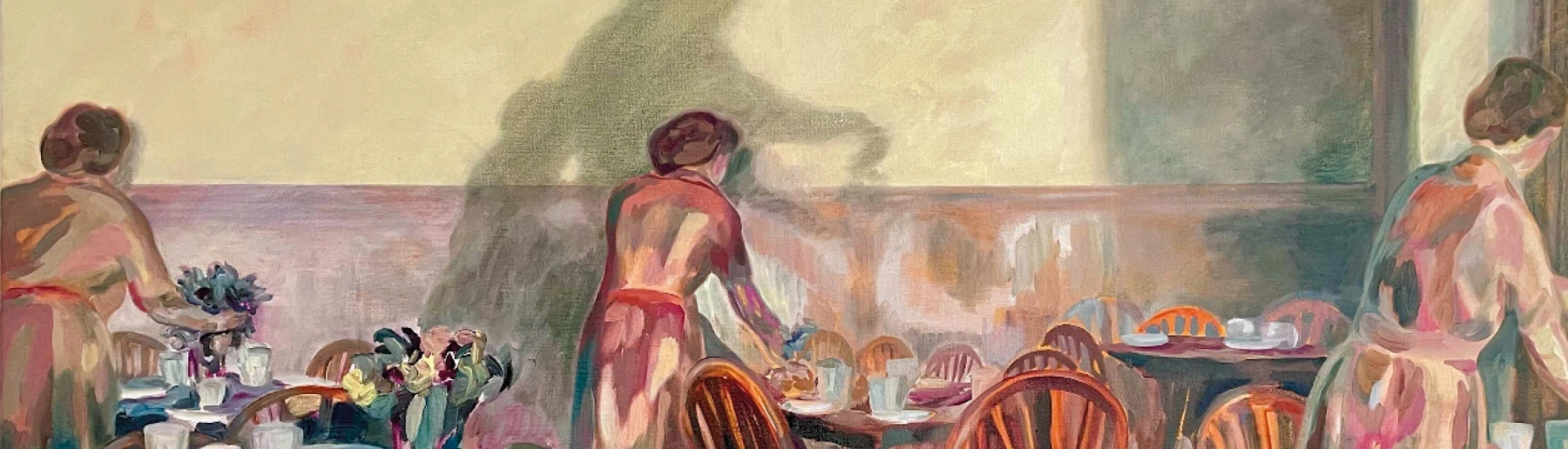 While most of the works in the show find their origin in the poetics of everyday life, they also act as metaphors to reflect on how identity is shaped and experienced. Anchored in an exploration of the interplay between imagination and reality, two works in particular reach beyond the quotidian. The Arrangement is based on an archival photograph taken at the nursery of Askham Grange prison, a women’s open prison in Yorkshire where mothers are allowed to live with their babies. In this work, we see staff members carefully setting the children’s tables with flowers, cups and plates. Here, Thoermer explores the cyclical nature of labour, and the relationship between care and confinement. In The Forest, the artist’s focus takes us into an exterior realm, blurring the boundaries between inside and outside, light and shadow, presence and absence. A place often associated with hidden fears and desires, The Forest symbolises the unconscious mind.