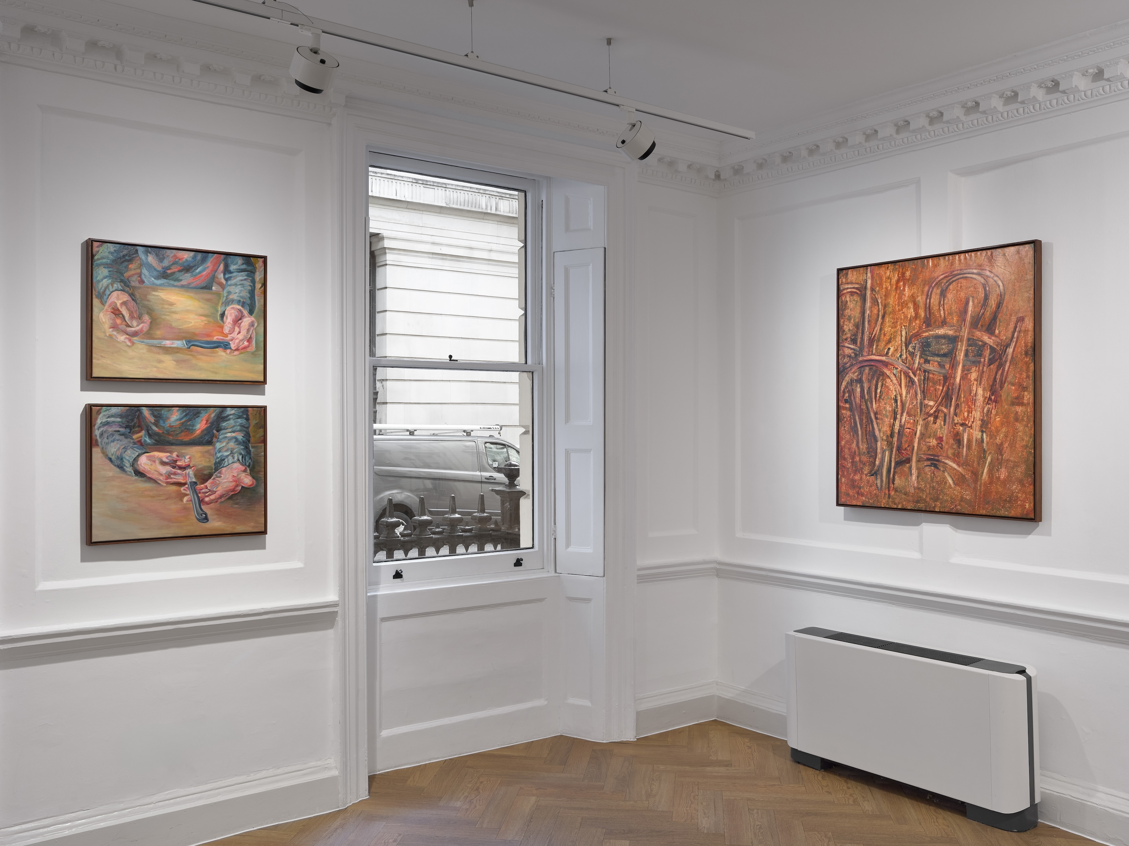 In The Periphery, Thoermer explores the notion of the edge — spatial, social and psychological — to reflect on what exists beyond the centre and within the quiet spaces that unfold at the margins of perception. The paintings on display, all created during the artist’s maternity leave, emerged from a period of stillness and close observation, when her gaze turned towards the subtle choreography of daily life. They depict mundane objects such as pots, dishes and chairs, while capturing the repetition in everyday gestures. Contrasting the static nature of traditional still life painting, these works carry a tangible sense of movement where the actions of stacking, holding, and arranging become part of a visually captivating humdrum routine.