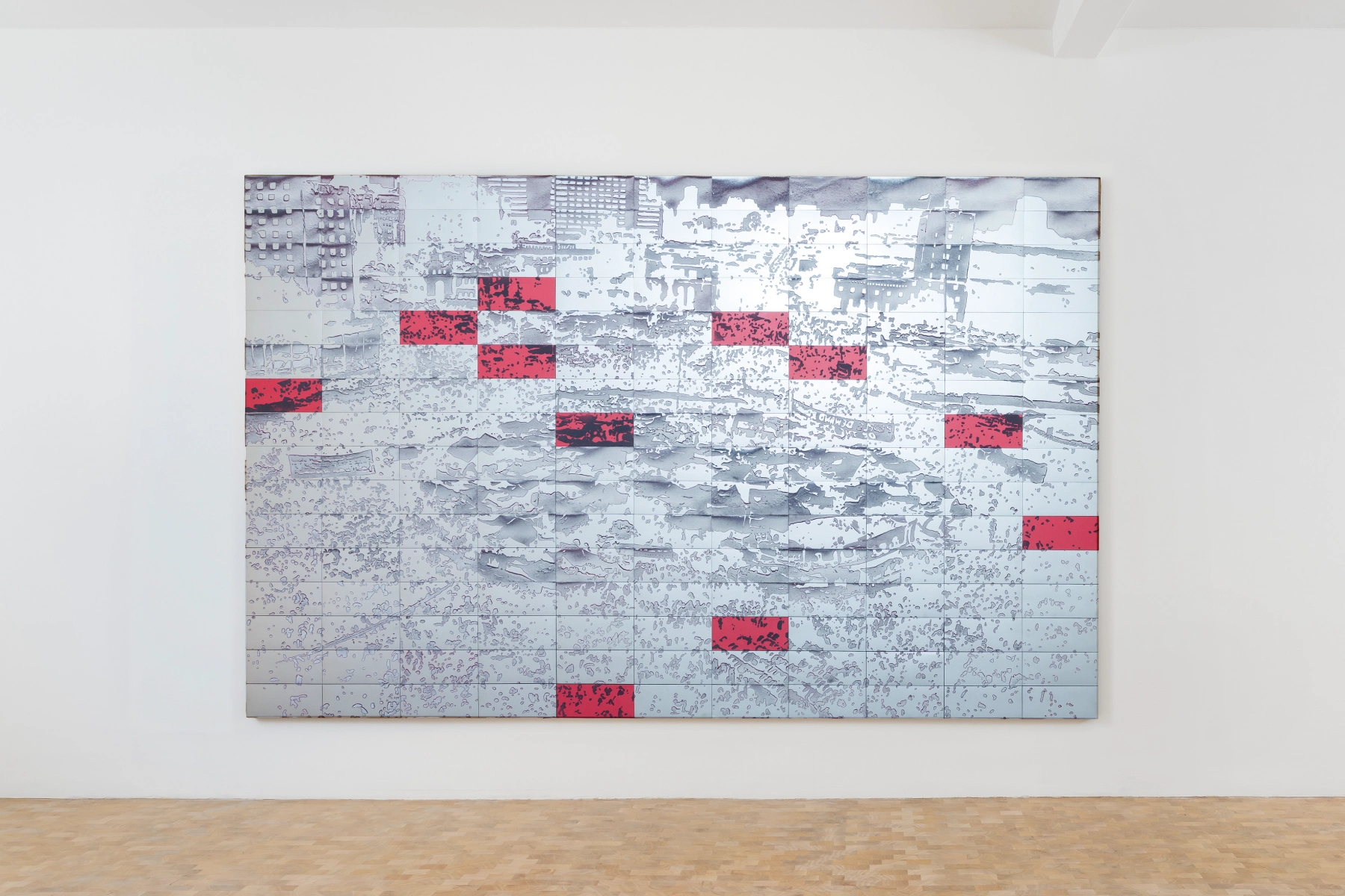 Presented alongside Timeline are examples from the three bodies of work it references. Circa 2011 (2016) is a major work in compressed lint and the final part of Kelly’s Circa trilogy, which explores the documentation of events in Western history via mediated imagery. It draws on the prolific, and often anonymous, internet images of the Arab Spring pro-democracy demonstrations, specifically in Tahrir Square in Cairo before the military takeover in 2011. Revealing an aesthetic shift from the curated images that shape our recollection of 20th century events, the work explores the advent of ‘citizen journalism’: vast networks of photographs taken with mobile phones that proliferate across the internet. Light noise projected onto the lint recalls the glare of a computer screen. Like memory, the image often slips into illegibility, highlighting and obscuring the inaccessible zones of the past. And, true to the trilogy’s title, the combination of lint and noise suggests imprecision, blurring, and an inescapable ambiguity.