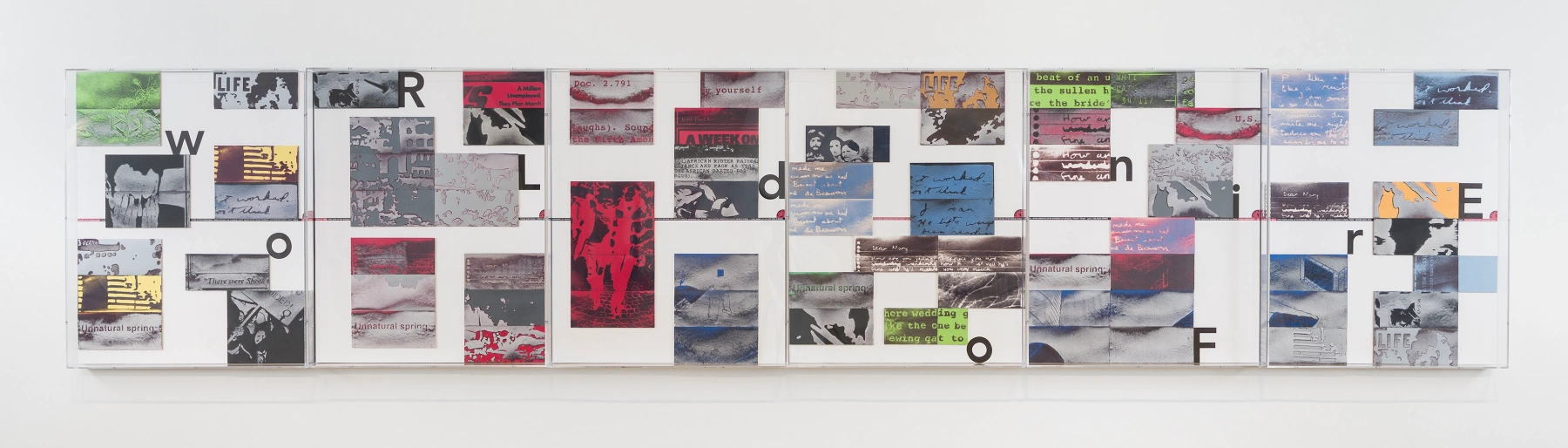 In her work, Kelly asks what defines an era, and for whom, not only as political discourse, but also as trace or residue of the personal lives that were defined by it. News from Home comprises three letters from Kelly’s archive, dating from her time living in London in the 1970s. Two examples from the series are on view: London 1974 gives a fleeting glimpse of communal living – women negotiating their commitment to activism with childcare, illness, accidents and domesticity – while Tucson 1972 addresses economic survival, alternative ways of living and political protest in the context of an escalating war in Vietnam. Likewise, two intimately scaled works, the covers of Life, April 1945 (2014), documenting the aftermath of the atomic bomb, and Shrew, December, 1970 (2017), connecting global conflict and feminist action, are subjects that still resonate today.