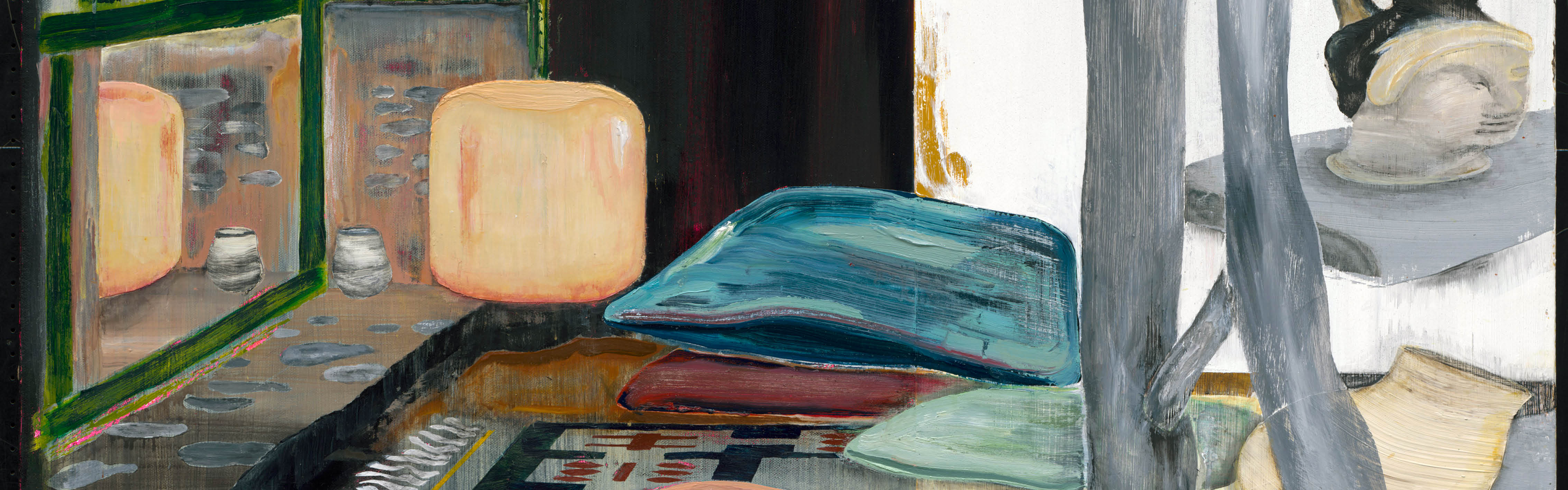 Originally seeking a break from the rhythms of his New York studio, Cole found in Canada a landscape dense with history and historicity (ie: narrative and story). Back in the studio, he began experimenting with new materials and different approaches to landscape, tackling the broadest-possible notion of that word. The seascapes he envisioned evolved into tightly constructed interiors: rooms, objects, and occasional figures take centre stage; windows frame and contain the landscape within architectural space; drapes conceal and reveal. These works also engage questions of craft, art history, and process. Their ambiguity evokes multiple sensibilities - at times suggestive of Moroccan casbah, Eastern European folklore, or someplace indeterminate, imaginary, or hybridized.
