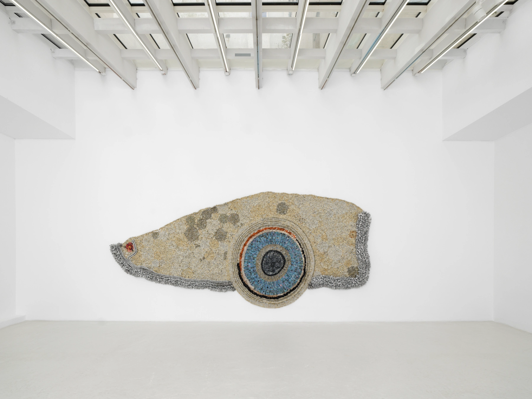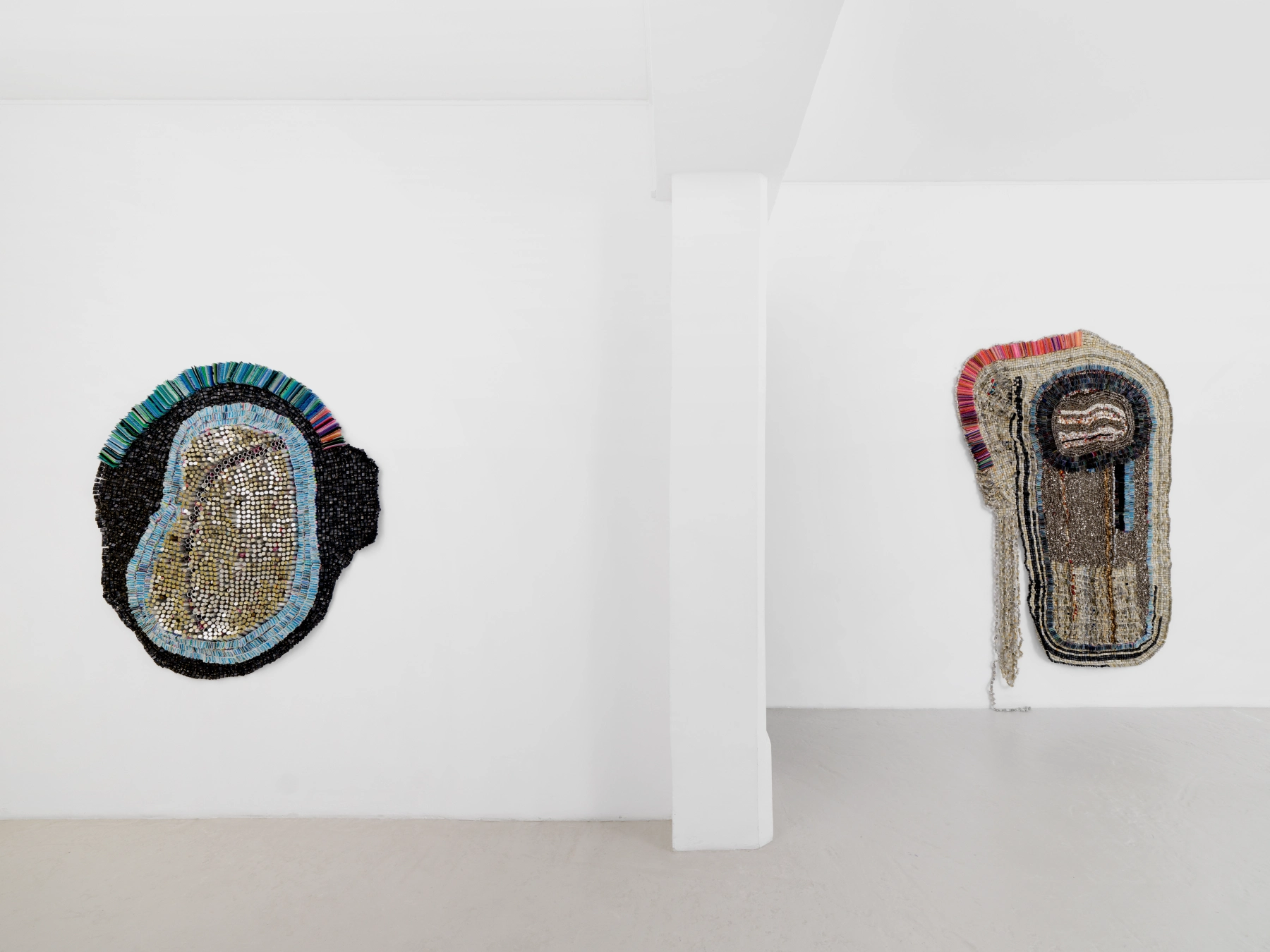 J’ai vu l’œuvre de Takadiwa en vrai pour la première fois lors de la dernière édition de la Biennale de São Paulo. À l’intérieur de l’immense pavillon moderniste où se tenait l’exposition, ses tapisseries semblaient respirer : les surfaces denses et chatoyantes vous maintenaient à distance tout en vous attirant vers elles. Construites à partir de boutons, de claviers d’ordinateur et de capuchons de bouteilles, elles n’étaient pas seulement des arrangements astucieux de déchets, elles étaient aussi des archives du désir, de l’accumulation et de la résistance. Leur abondance semblait à la fois festive et élégiaque, une tension qui ne fait que s’accentuer dans l’exposition The Crown! à la galerie Semiose.