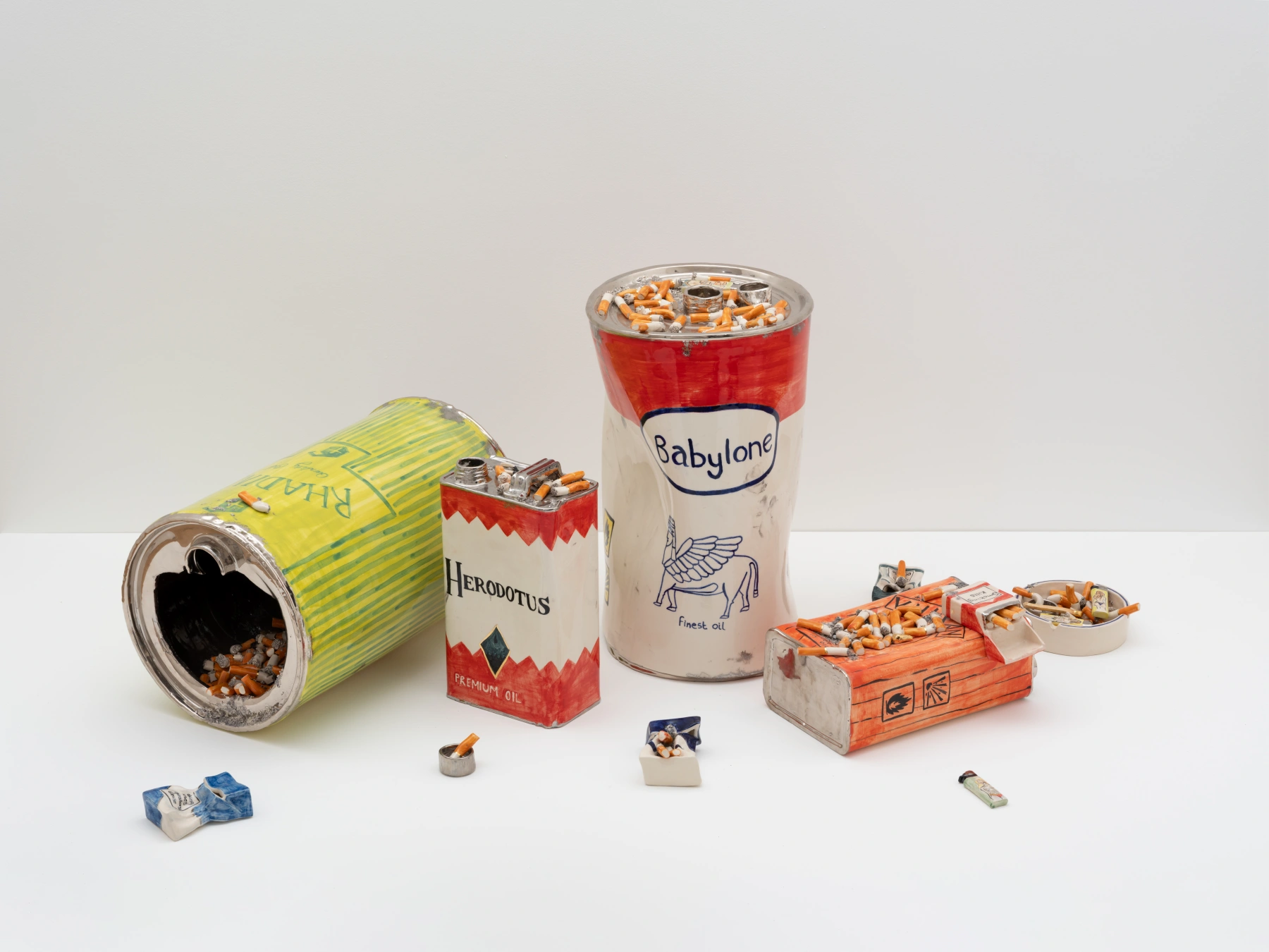 In the following room, the exhibition explores themes of excess, decadence, and celebrity, as well as the spaces of nightlife where they take shape. Andy Warhol’s gelatin silver prints from Studio 54 immortalise the notorious nightclub as a place of style and spectacle, and document a world where the night offered possibilities for reinvention within the club walls. As Warhol captured the living glamour of nightlife, Alma Berrow translates its aftermath and remnants. Her ceramic installation Alls Swell (2023) transforms the late-night atmosphere into sculptural forms and objects that hold the residue of the night, suggesting how nightlife leaves behind physical traces of experience.