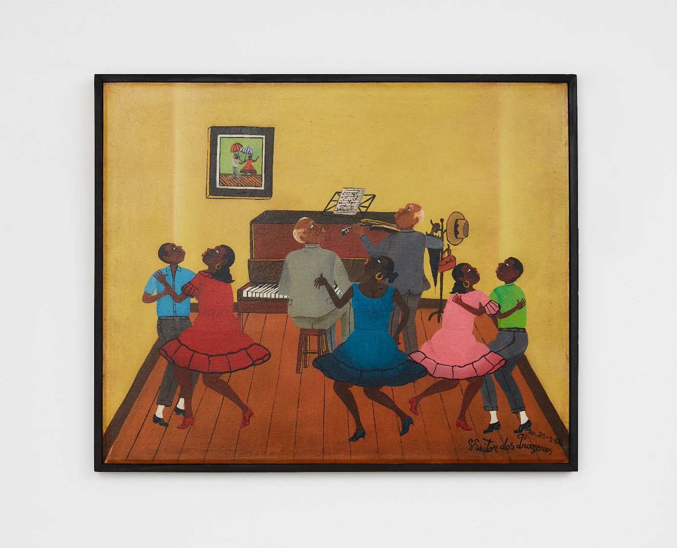 The exhibition opens with the pulsating energy of Night Shift (2025), a vibrant large-scale painting by Eli Sudbrack (b. Rio de Janeiro, 1968) from the São Paulo-based collective avaf. Drawing from the visual language of discos, dance parties, and underground clubs, the work explodes with kaleidoscopic colour and movement that embodies the dancefloor. Rooted in queer visual cultures and shared forms of expression, avaf transforms painting into a celebratory platform for participation and connection. This collective energy finds historical resonance in Sem tÃtulo [Untitled] (1962) by Heitor dos Prazeres (b. 1898, d. 1966, Rio de Janeiro), a pioneering samba composer who later turned to painting. Dos Prazeres translated the rhythms of Afro-Brazilian life, including samba, carnival, and the rituals of everyday festivity, into dynamic compositions which showcase celebration as a profound cultural ritual and a means of shaping identity.