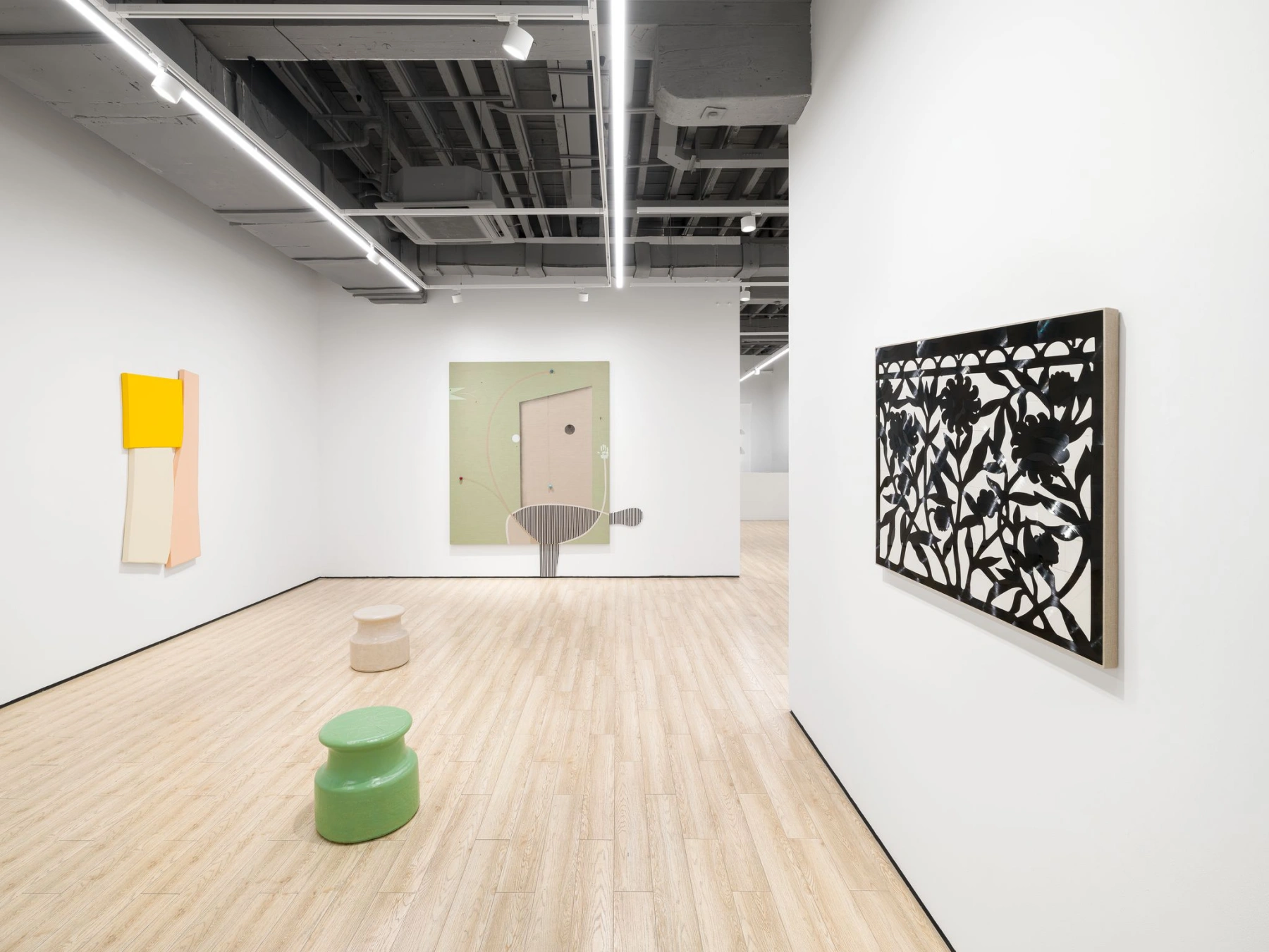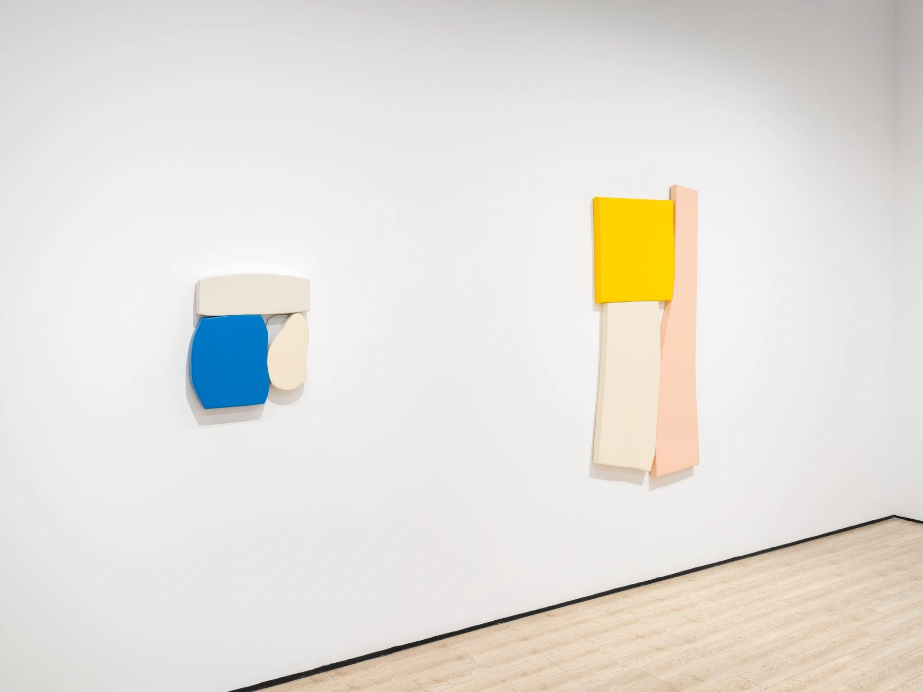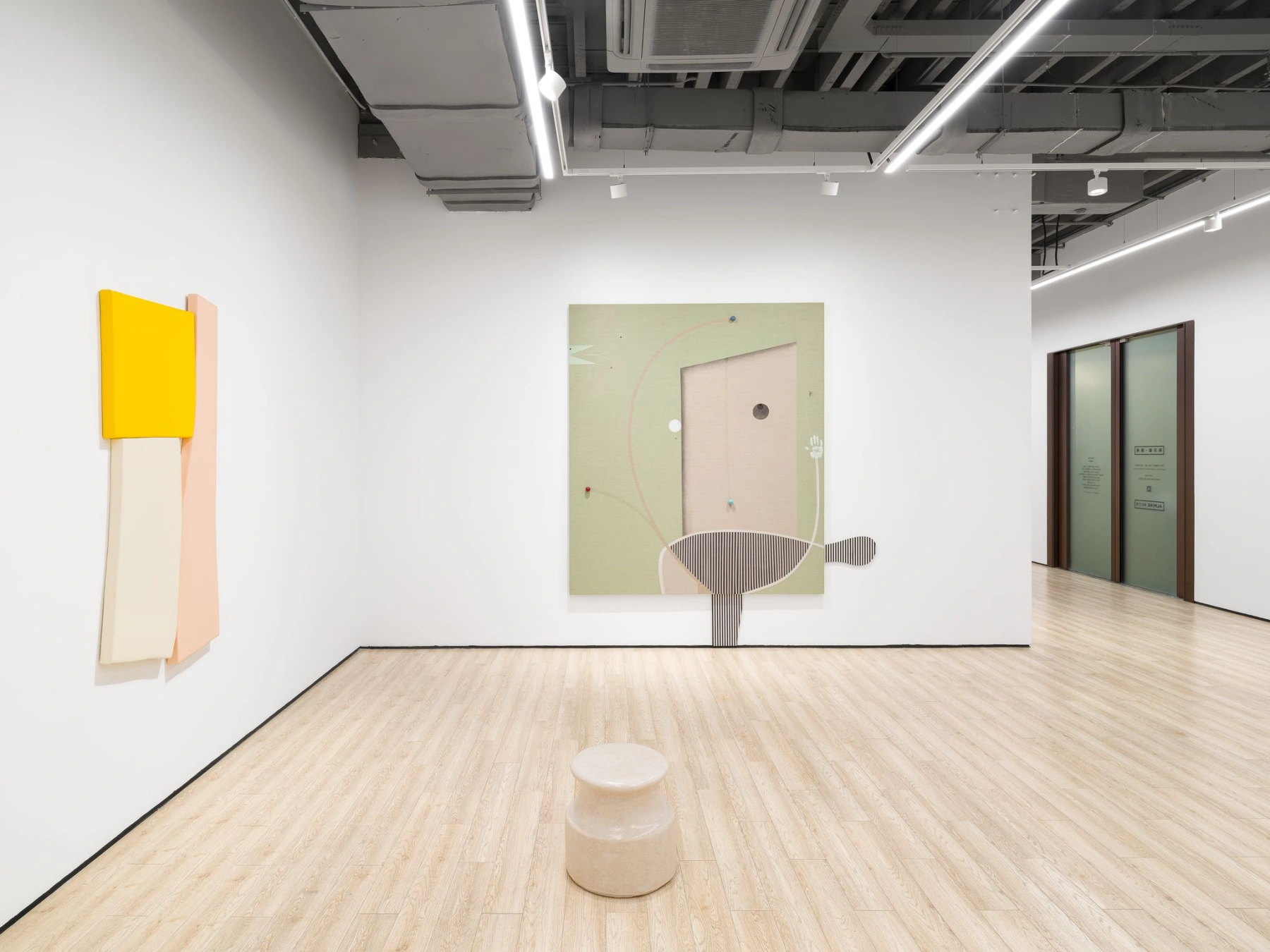 On a large canvas that incorporates ink, acrylic, graphite, pins, and small balls, Matthias Bitzer creates a tension between flat drawing and protruding object. Pins hold spheres at slight distances from the surface, casting shifting shadows, while striped shapes appear to slip behind the painted plane. Meticulous execution meets deliberate interruption, with protrusions and attachments anchoring attention in specific tactile points. And then there is Justin Adian, whose shaped canvases puff outward, stuffed with foam or felt. Their glossy skins shine with the precision of a carโs paint job, yet their forms sag with a softness you can almost feel. Is it hard? Is it soft? The mind cannot decide, and in that indecision lies the seduction. But you know you want to press a palm into one, just to know if the softness is real or if it is an illusion as carefully maintained as any brushstroke.