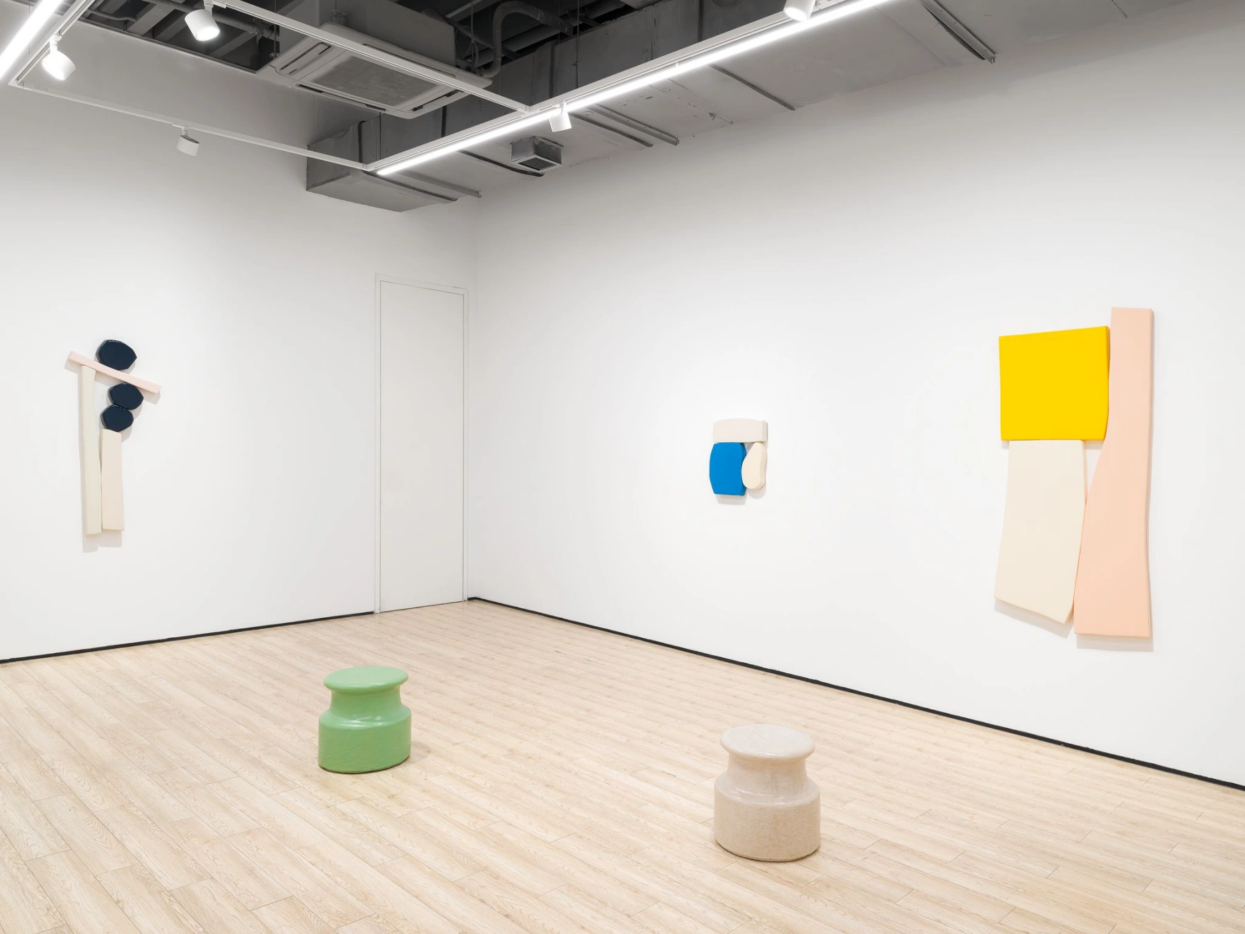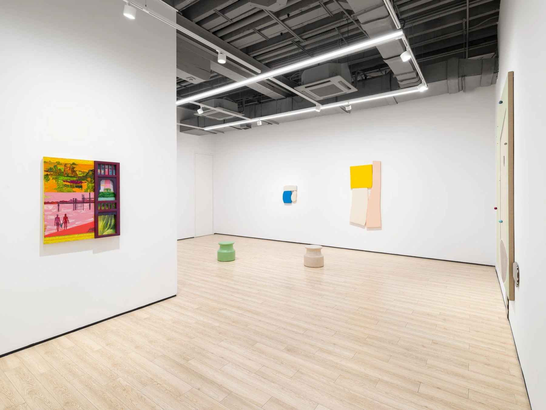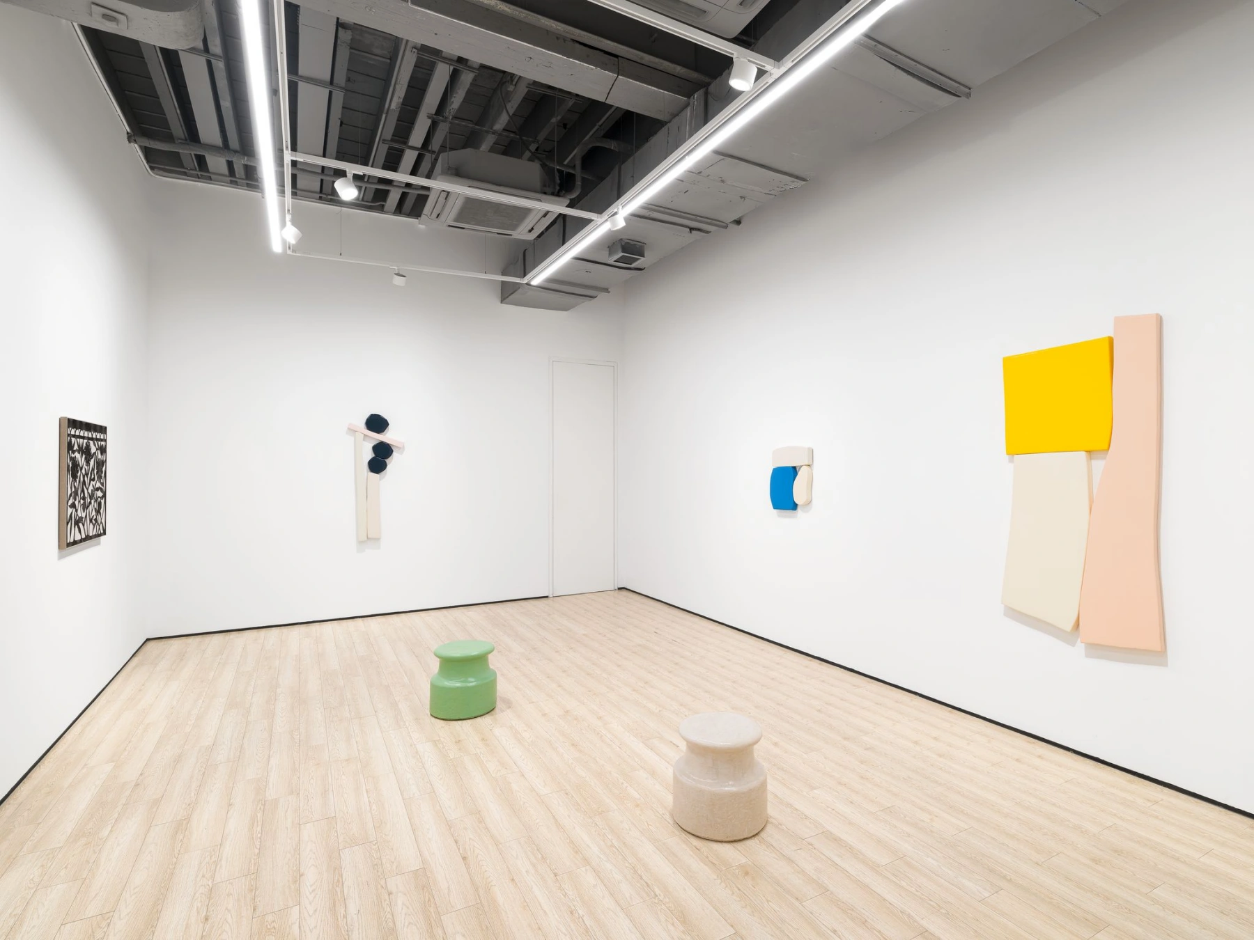 On a large canvas that incorporates ink, acrylic, graphite, pins, and small balls, Matthias Bitzer creates a tension between flat drawing and protruding object. Pins hold spheres at slight distances from the surface, casting shifting shadows, while striped shapes appear to slip behind the painted plane. Meticulous execution meets deliberate interruption, with protrusions and attachments anchoring attention in specific tactile points. And then there is Justin Adian, whose shaped canvases puff outward, stuffed with foam or felt. Their glossy skins shine with the precision of a carโs paint job, yet their forms sag with a softness you can almost feel. Is it hard? Is it soft? The mind cannot decide, and in that indecision lies the seduction. But you know you want to press a palm into one, just to know if the softness is real or if it is an illusion as carefully maintained as any brushstroke.