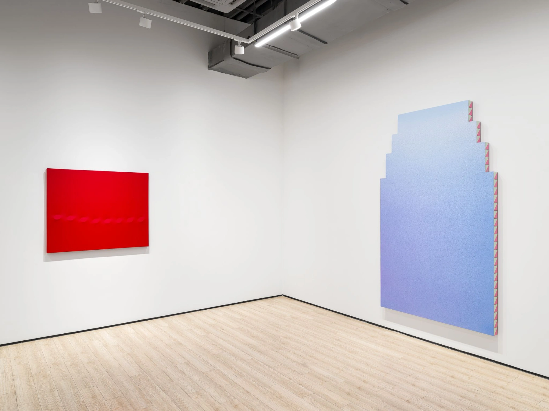 At the heart of the exhibition is Turi Simeti, a master of postwar Italian art and a pioneer in taking painting beyond the flat surface. From the early 1960s onward, he developed a distinctive language of shaped canvas, pressing precise oval forms from behind the plane so that light and shadow became active elements in the work. 8 ovali rossi (2018) appears at first to be a red monochrome, but closer looking reveals eight ovals gently pushing outward beneath the taut acrylic surface. Over decades, Simeti refined this distilled vocabulary into something timeless, turning painting into a luminous object that holds and shapes the surrounding light. The light that moves across the gentle curves is so subtle it could be missed, yet once seen, the urge to reach out and trace the protrusion is hard to suppress.