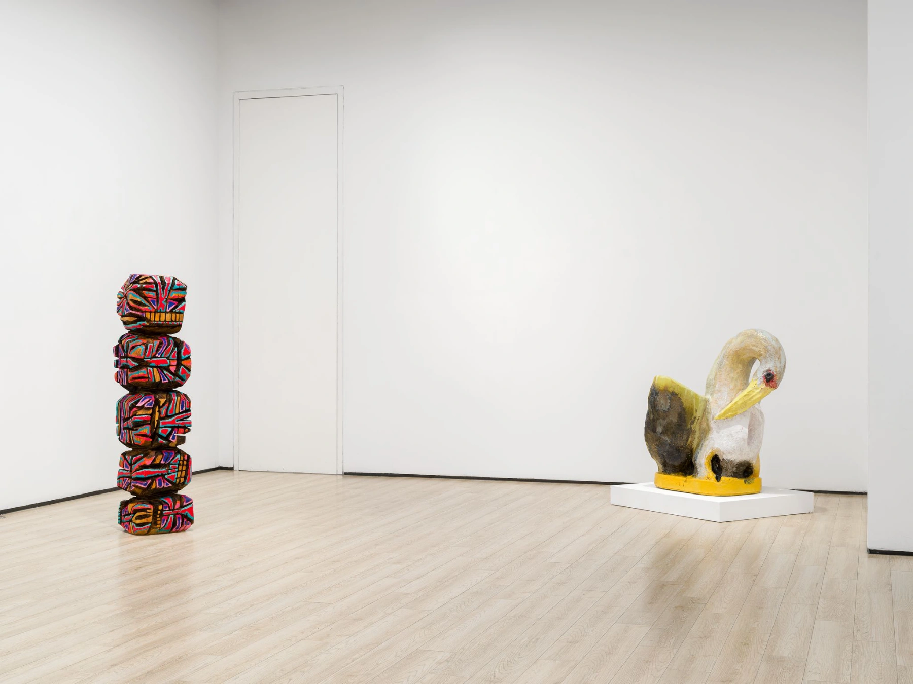 The confrontation with matter becomes primal and instinctive in Ryan Schneiderโs totemic sculptures. His process involves cutting, chiseling, and shaping until the wood yields a rhythm of planes and voids. Standing before the work, one can clearly sense both the force that shaped it and the patience in its making. Rising like a totem, it balances between weight and fragility, existing both as a vertical image and as a three-dimensional presence beyond flatness. Erik Lindmanโs work begins with found and discarded materials, reconfiguring epoxy, urethane resin, plaster gauze, wood, metal, plastic, and enamel paint into sculpture. The surface alternates between smooth passages and rough fissures, retaining traces of handwork and evoking the presence of a fossilized remnant. Here, tactile qualities are inseparable from form, suggesting a fragment of something once living.