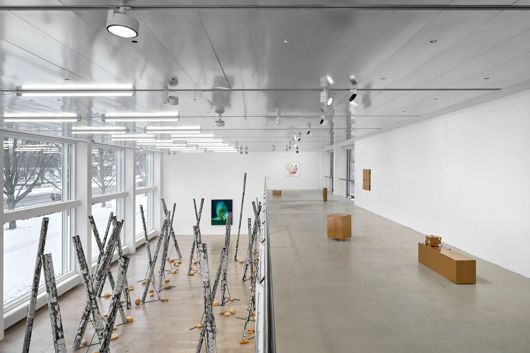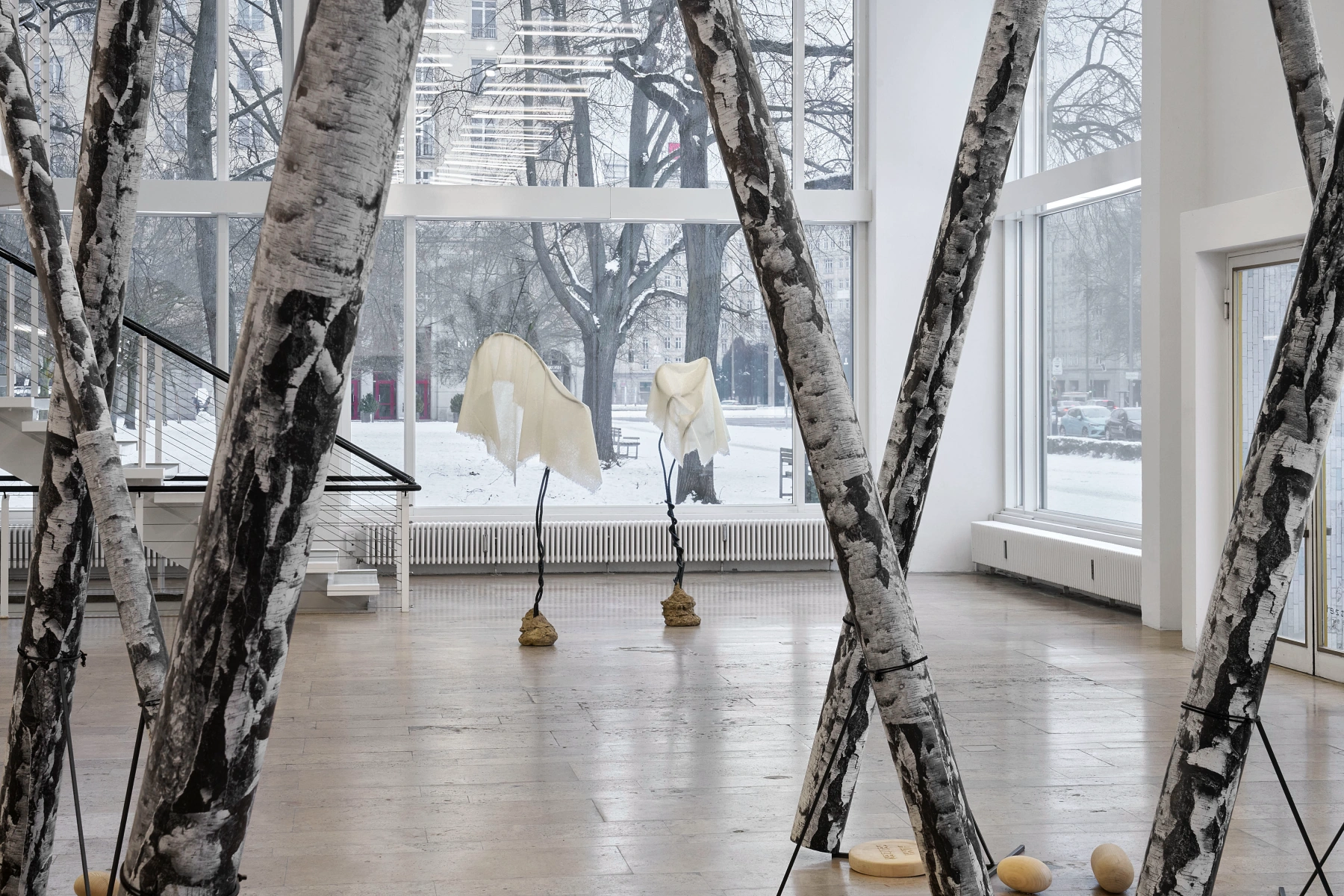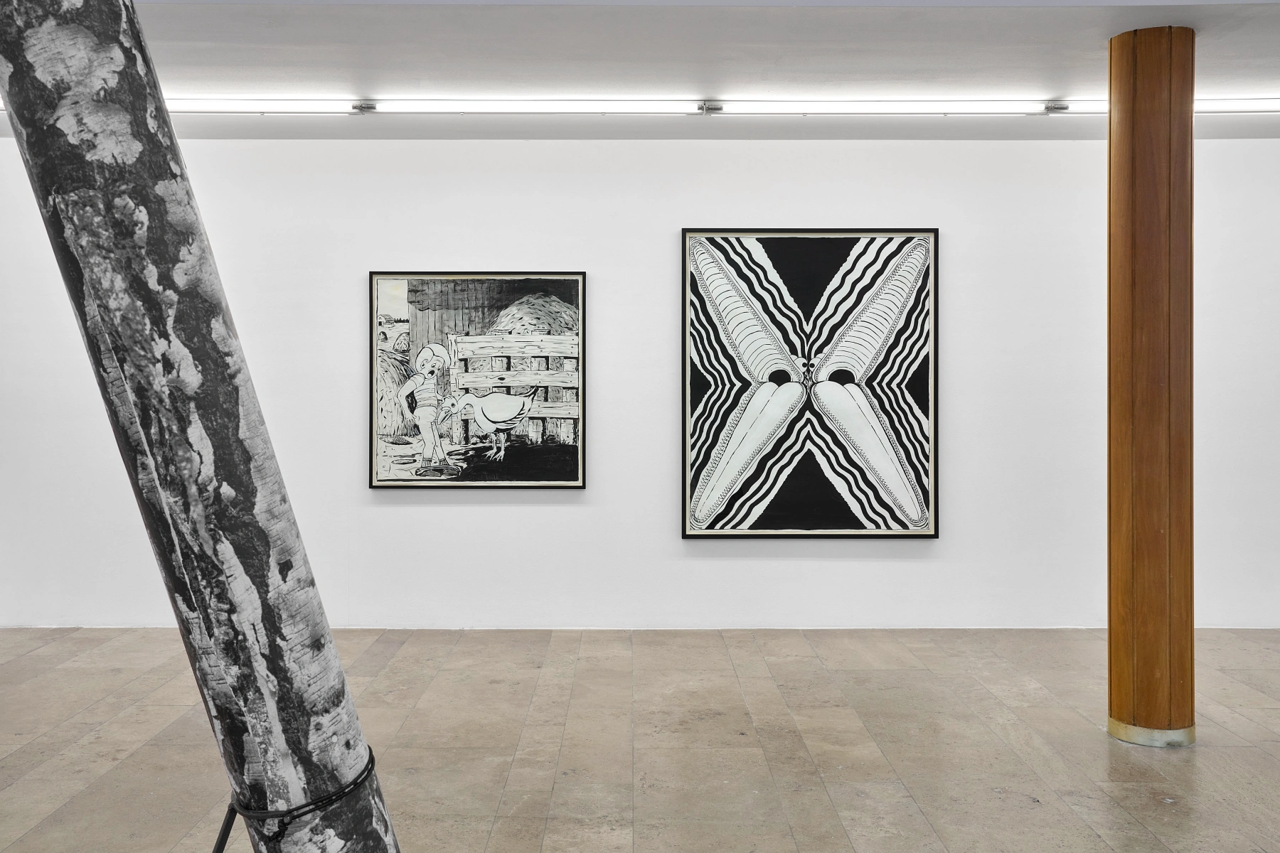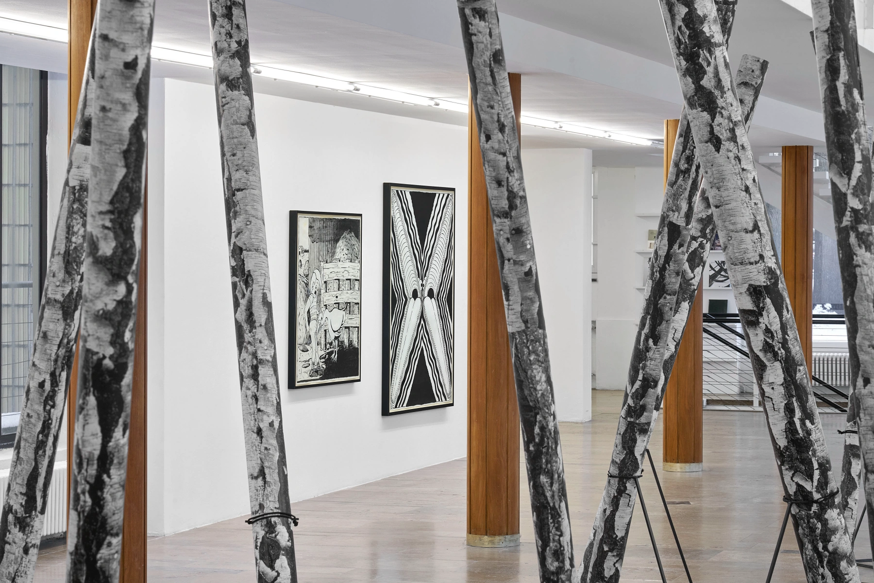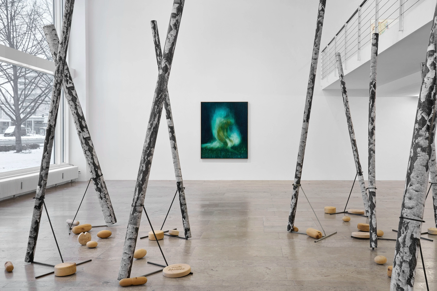 In Beckett’s Not I, the voice is severed from the body, speaking without pause or control, an articulation driven less by intention than by compulsion. This sense of being overtaken, of speaking before understanding, finds resonance in the works in the exhibition, where forms and narratives seem to emerge from places, where the past insists. It transforms what in Beckett appears as crisis into an act of recognition, opening room for the past to return in unruly shapes. Martin Kippenberger’s (b. 1953; d. 1997) installation Jetzt geh ich in den Birkenwald, denn meine Pillen wirken bald (Now I‘m going to the birch forest, because my pills will soon take effect), with its distorted birch trunks and scattered pills, stages a forest as a site of psychological disorientation, where perception buckles.