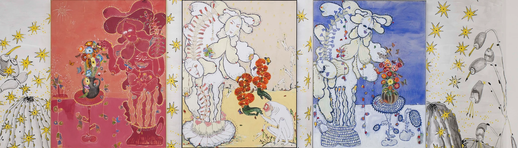 At the SLG, Pjota will present a new series of paintings against an expansive mural painted directly onto the gallery walls to create a magical environment populated by mythical characters, dragons, crocodiles, monkeys and imaginary beasts. The sun, stars and moon are recurring motifs in Pjota’s cosmos, as are ancient and modern vases, shells and invented vessels, often brimming with fantastical flowers. Bringing together such disparate elements from the past, present and an imaginary world, Pjota introduces us to a new universe in which established hierarchies of value attributed to various objects, artefacts and cultures are dismantled, making way for an alternative future.