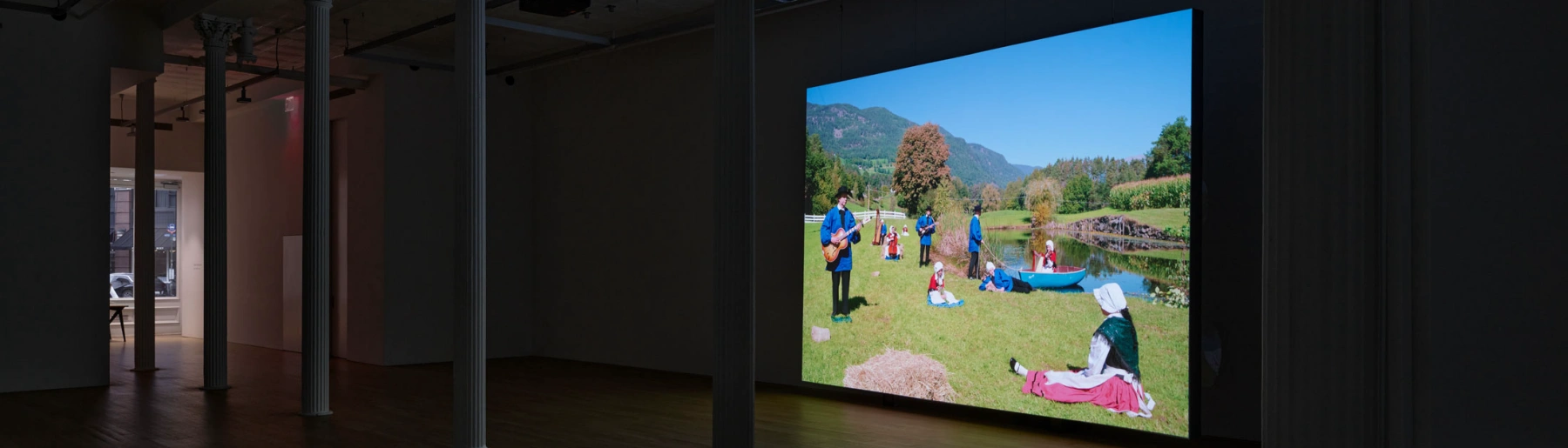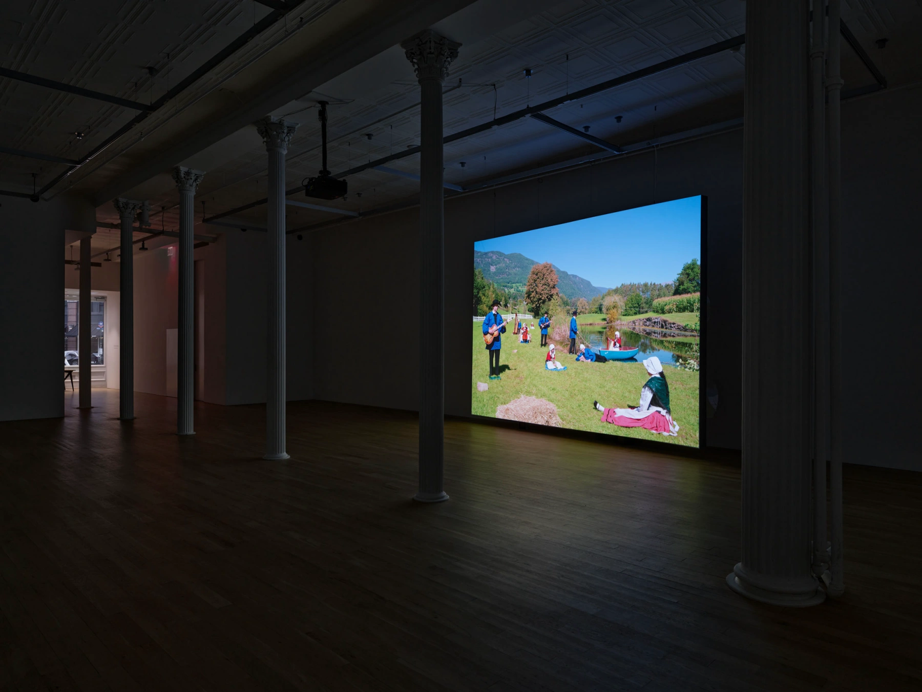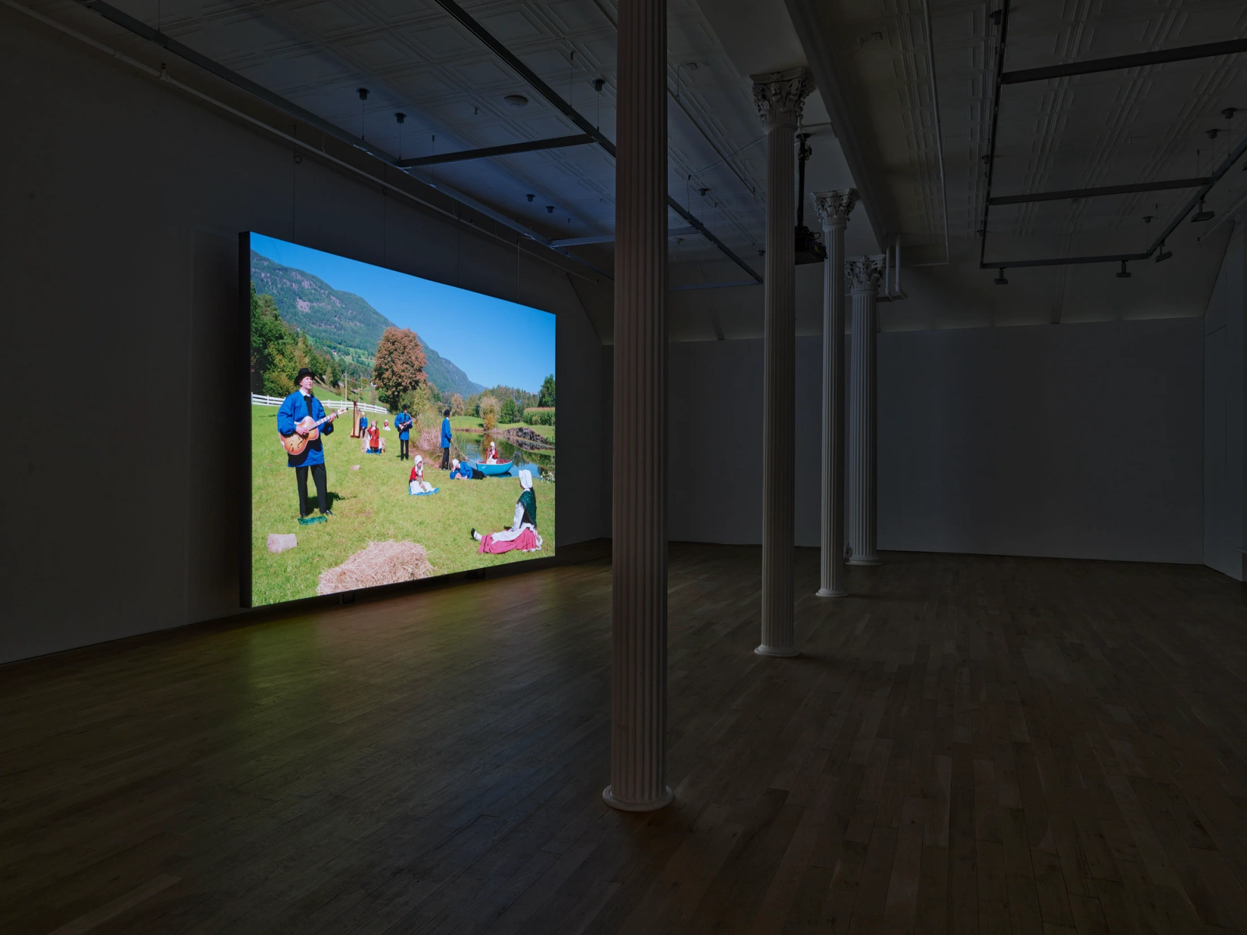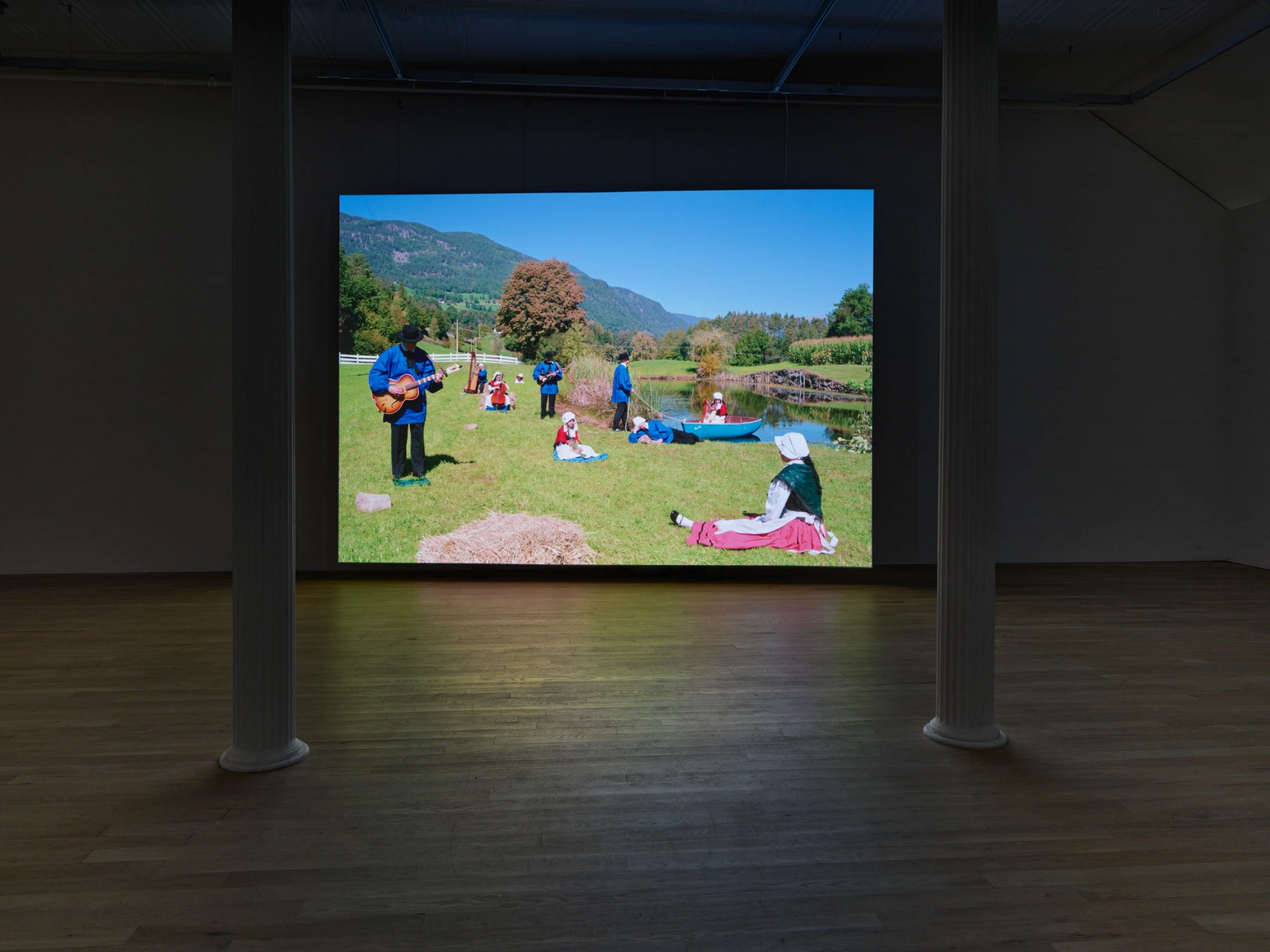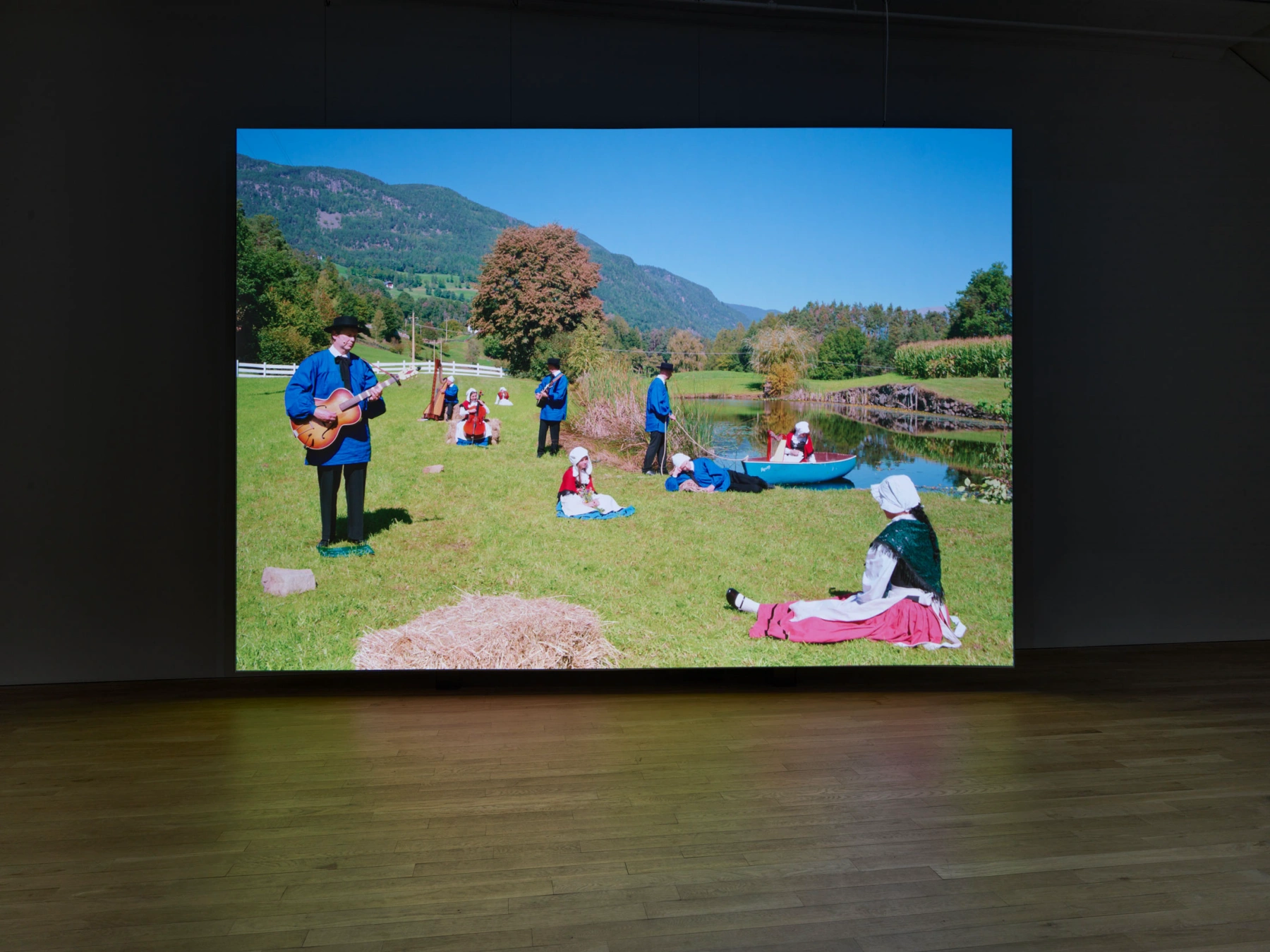 Sunday Without Love is inspired by a mid-twentieth century postcard that lives on Kjartansson’s fridge depicting a scene of people wearing matching folk costumes in a nameless location and, incongruously, one of them holding a jazz guitar. Kjartansson, along with nine other performers, donned outfits to mimic this postcard and performed a fragile chorus on repeat in a similar idyllic, pastoral setting. The music was adapted by Kjartansson and frequent collaborator Davíð Þór Jónsson from “Ohne Liebe Leben Lernen,” a 1996 comedic song by German artist Rocko Schamoni. Set against the backdrop of the quiet, and deeply European, countryside the lyrics, “You must learn to live without love,” disrupt the bucolic mood with a feeling of tragic longing, endings, and stoic resignation. In a confluence of references from classical pastoral painting to traditional romantic ballads, the work evokes a portrait of unrequited love as well as a Buddhist sense of acceptance. The video Sunday Without Love was produced from a performance commissioned by TRANSART25, that was originally presented in Renon, Italy in September 2025.