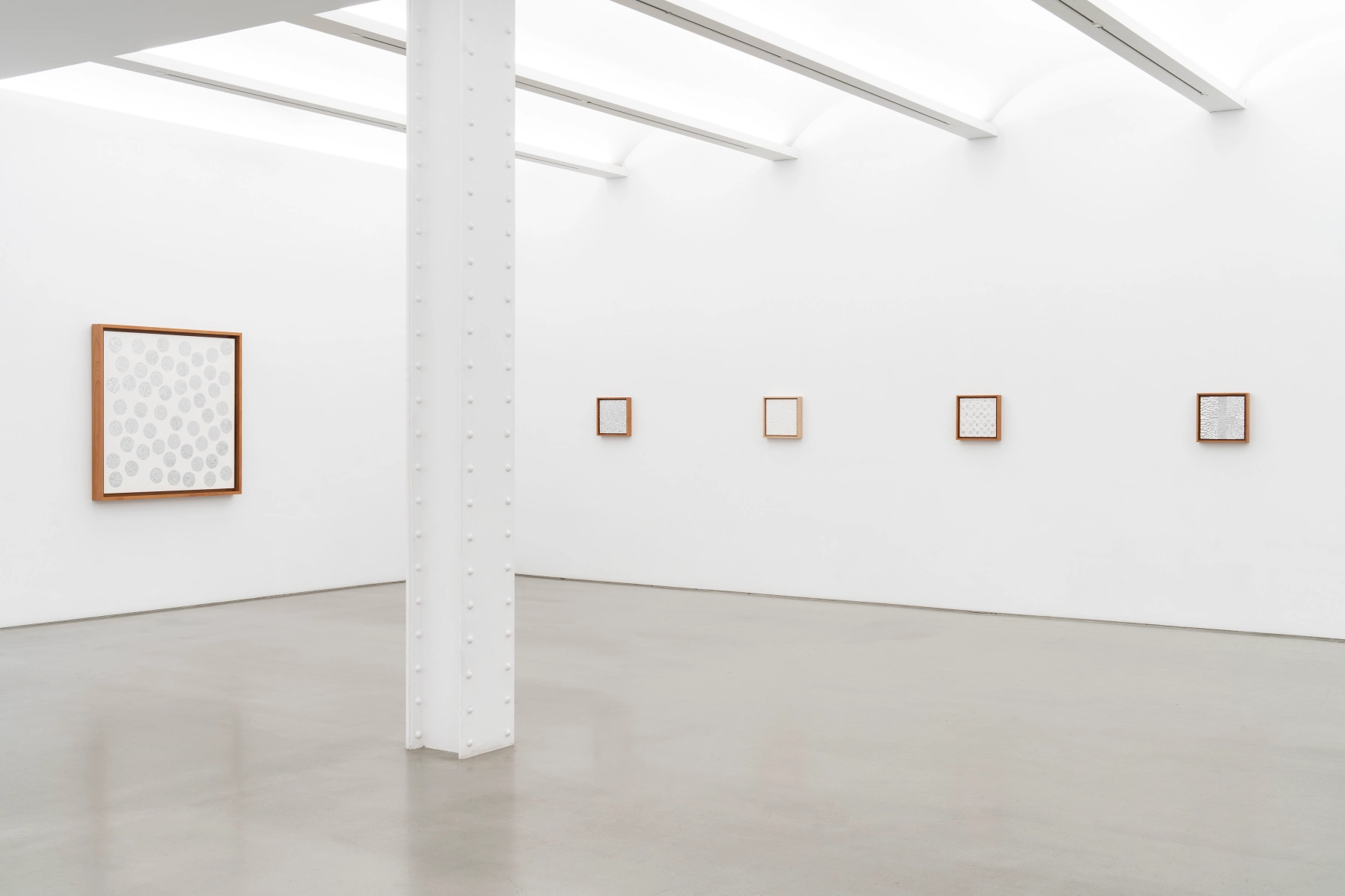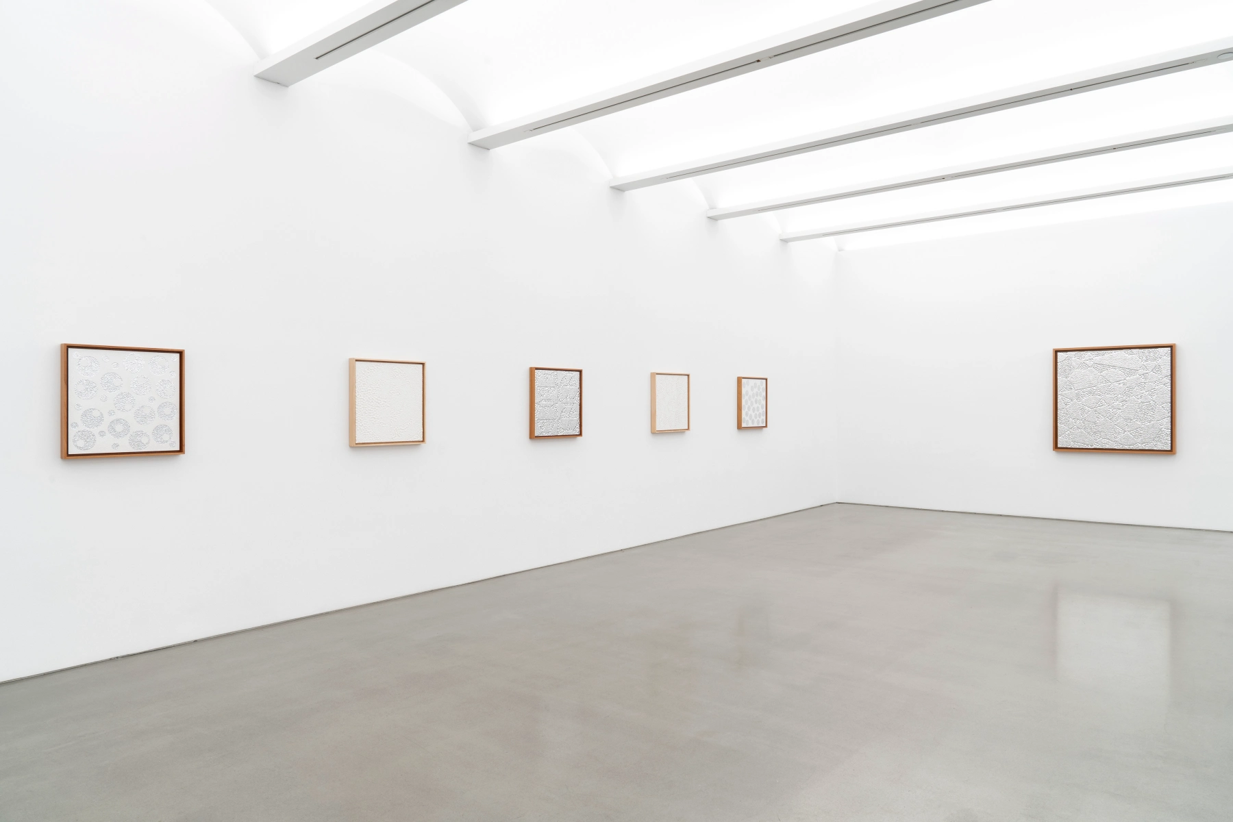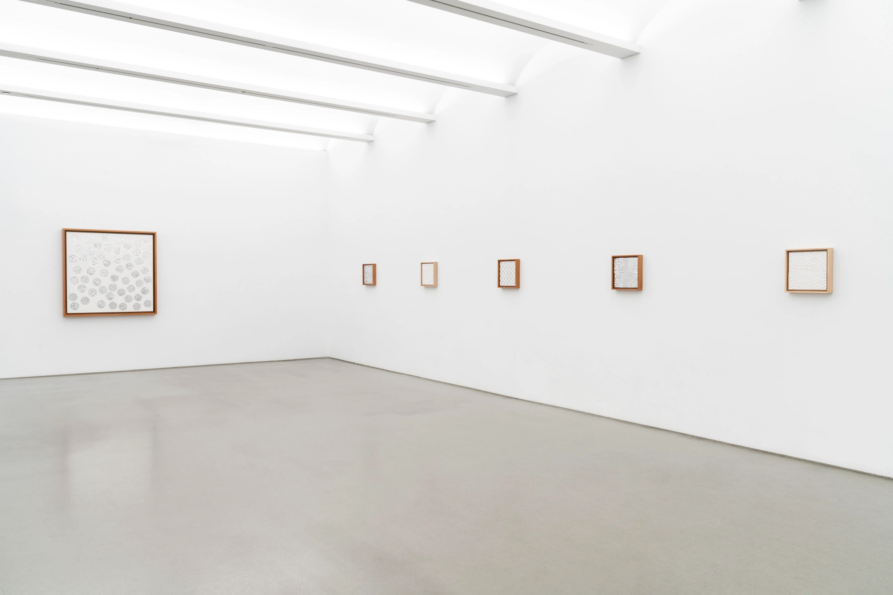 The works gathered in Repeated Original exemplify a practice grounded in repetitive processes, understood as a form of active meditation. Repetition here is continuity and, at the same time, transformation: it does not operate as a style, but as an evolutionary mechanism, as if each series were a species undergoing change. The original series gradually moved beyond monochrome to incorporate geometric patterns that intersperse eggshell fragments of varying sizes and tonalities, as seen in 2,155 (666 concave and 1489 convex eggshell fragments). In 2019, the artist began a new series, Between What I Reflect and What I See, replacing eggshells with spherical aluminium-coated glass.
