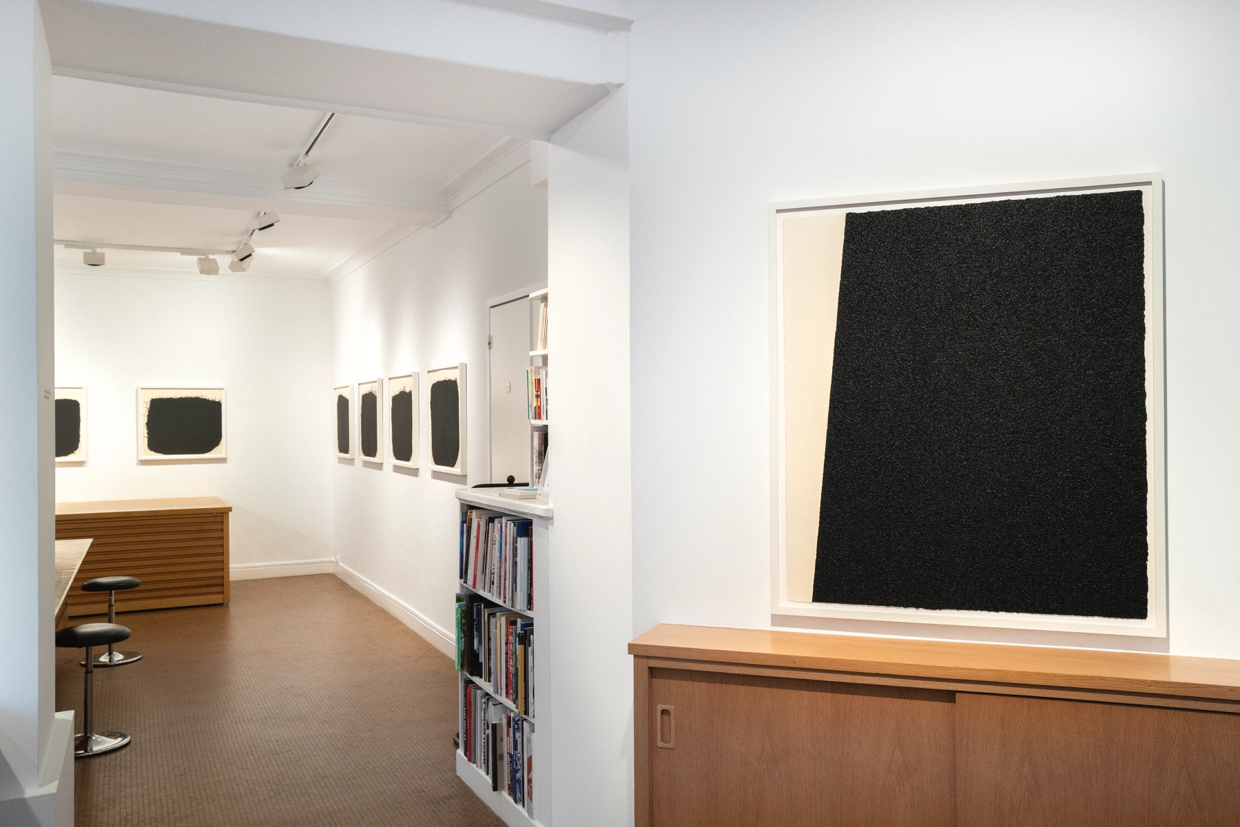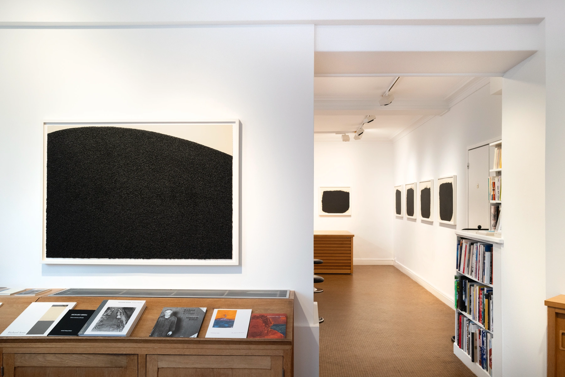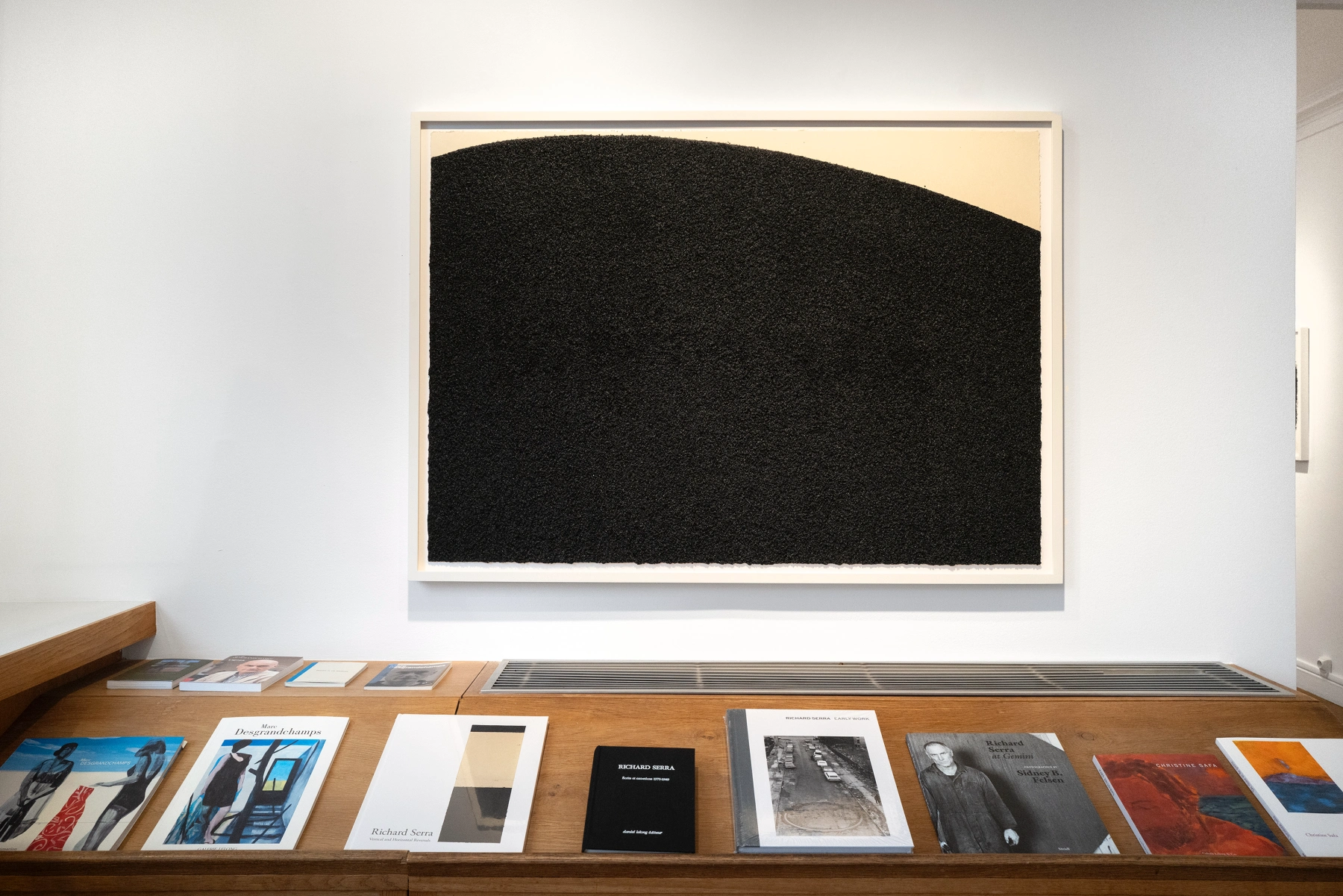 The Hitchcock series extends Serra’s exploration of the materiality of black. Produced without a press, these works are the result of an intense manual process, in which a dense mixture of black pigment, linseed oil, melted wax, and silica is directly applied to paper. Layer upon layer, this material creates surfaces of striking intensity, almost sculptural in presence. The black, omnipresent, absorbs and reflects light, generating an impression of monumental void. The edition consists of 56 impressions, each signed by the artist.