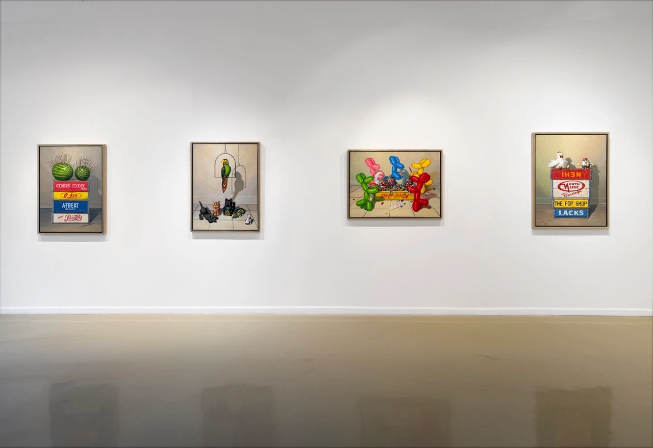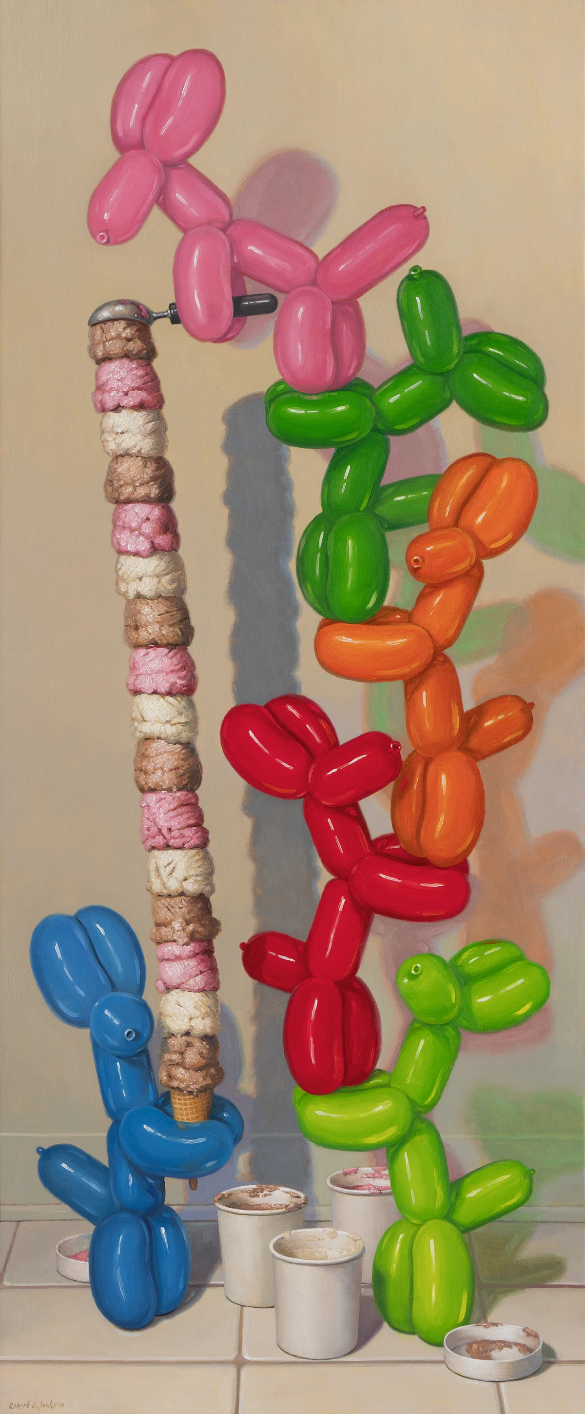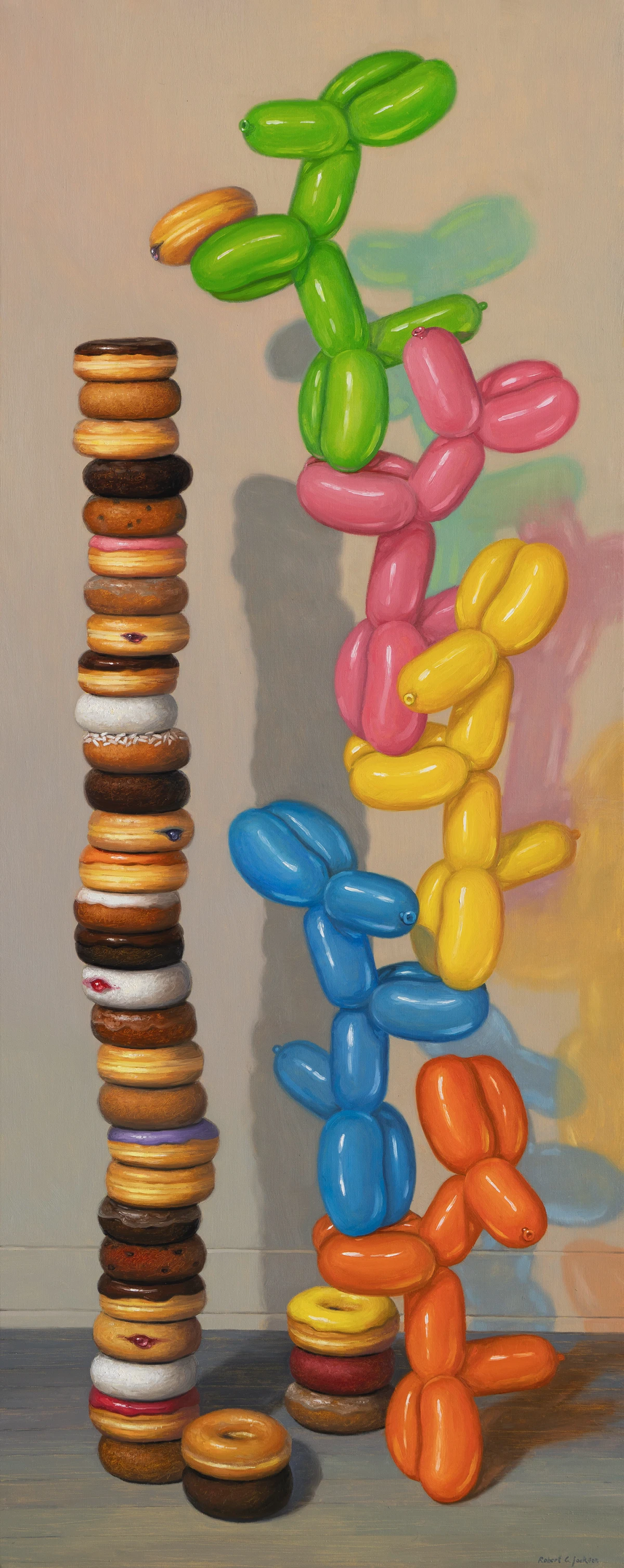 In pieces like Scoops and Donut Stackers Jackson presents his iconic balloon dogs in anthropomorphized scenes of debauchery. Breaking the fourth wall, certain dogs cheekily face the viewer, seemingly inviting us in on the joke. Jackson says, “Funny is hard work. I’ve always loved the phrase “seriously funny” and often have written it in my sketchbook. It is my hope that my paintings will find a home and will hang on that wall for a long time, so I want to create paintings that make people smile again and again. I challenge myself to create punchlines that are eternally funny, I want a painting to have legs and last beyond simple, pithy statements.”