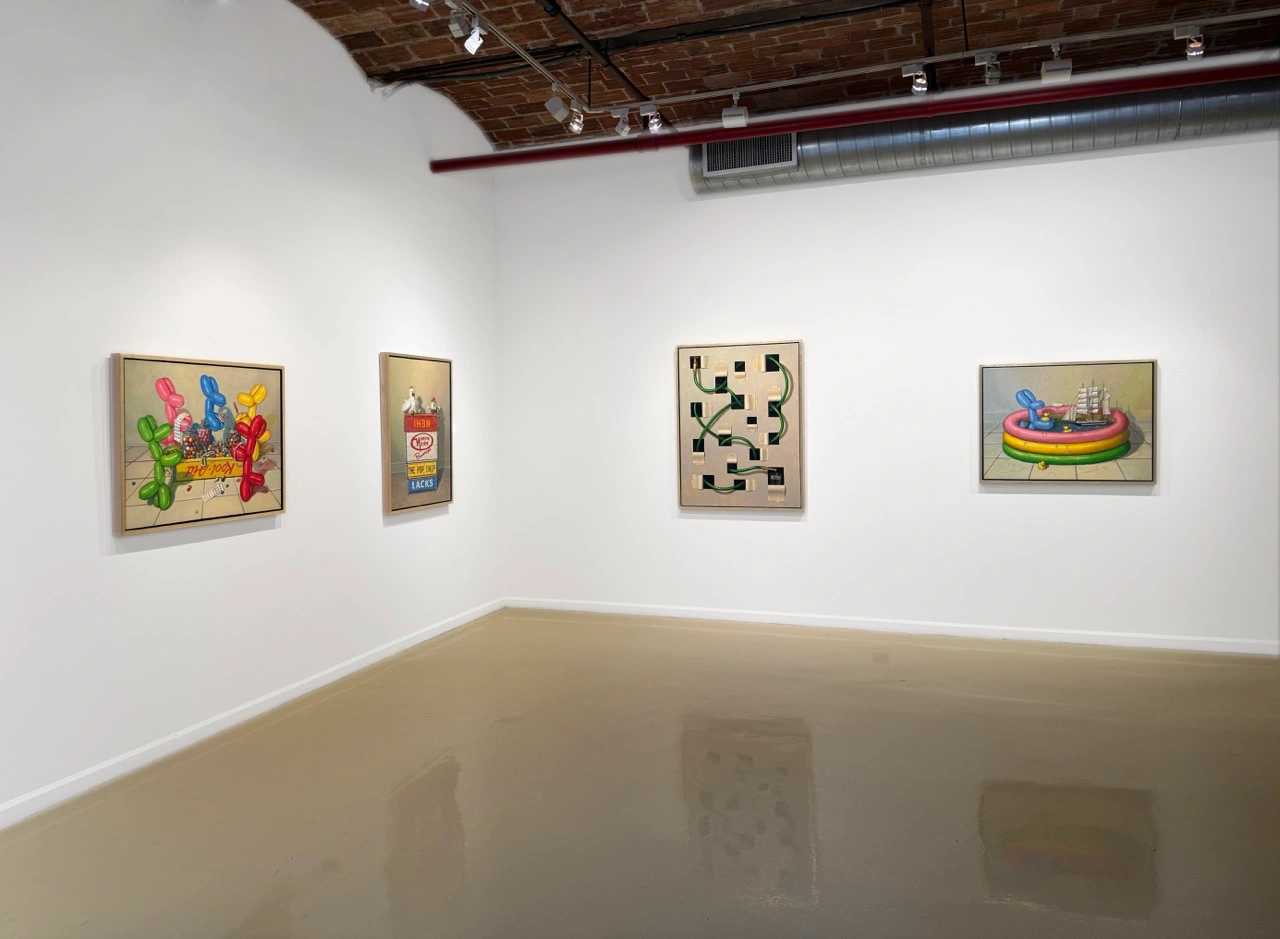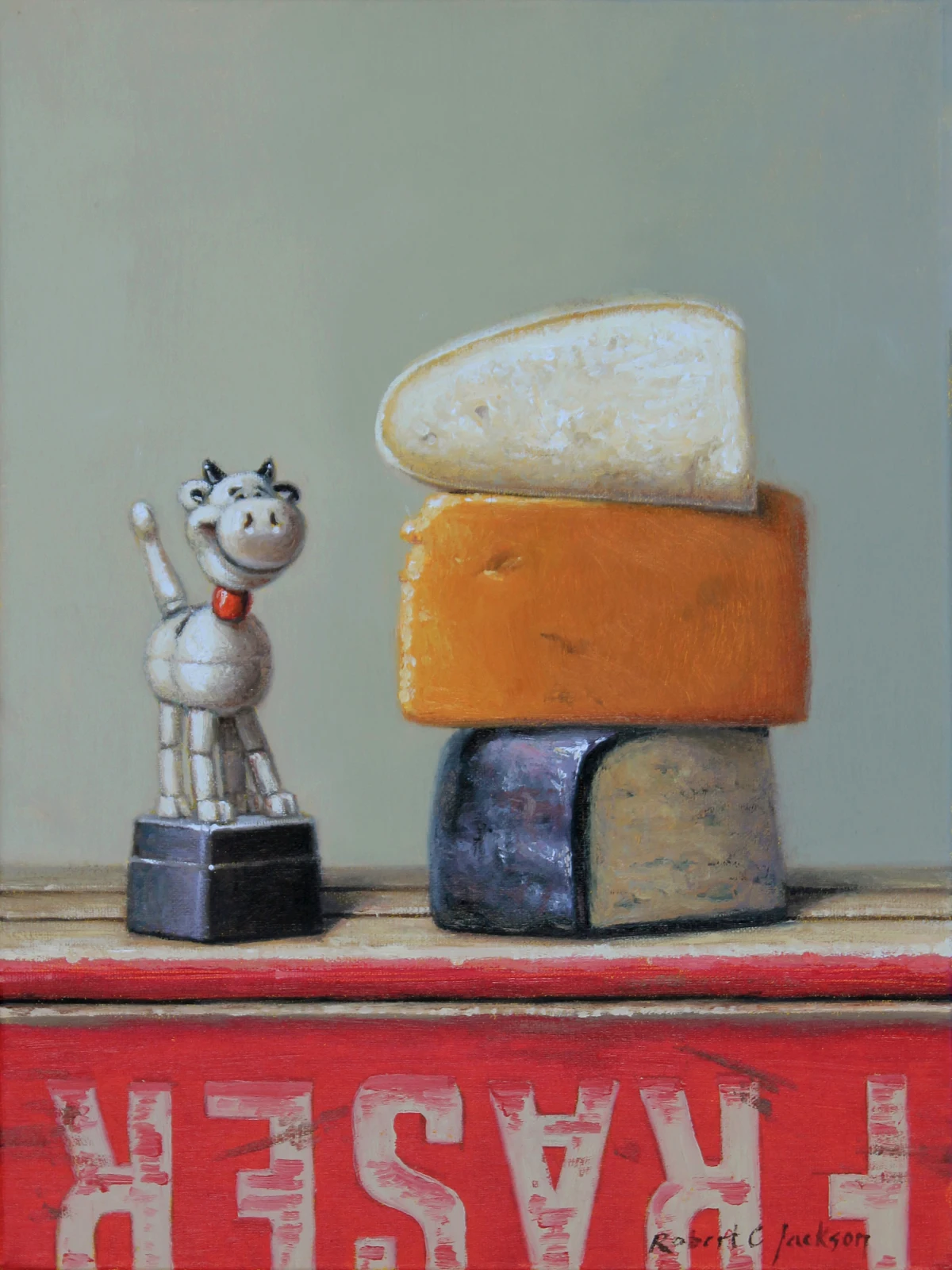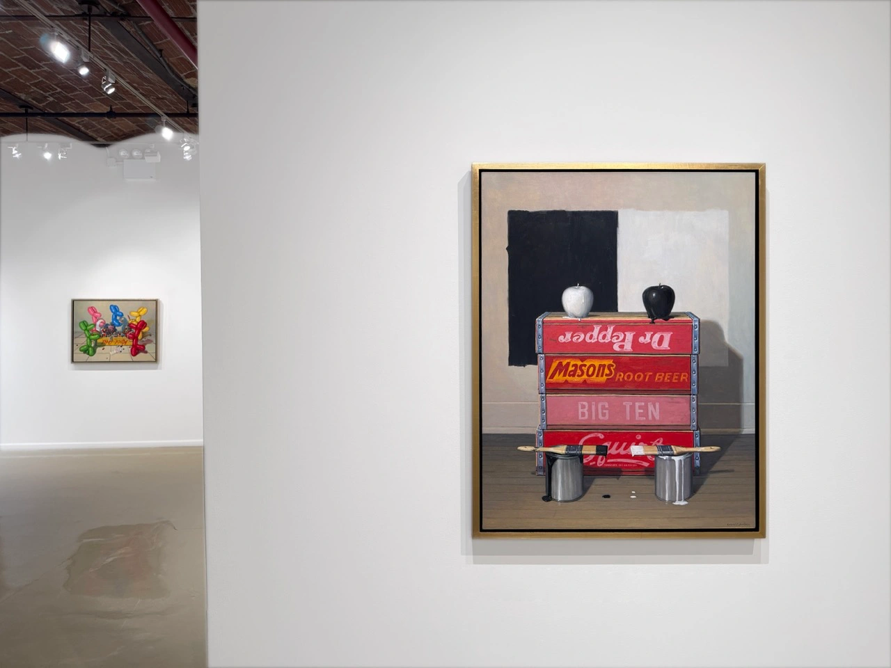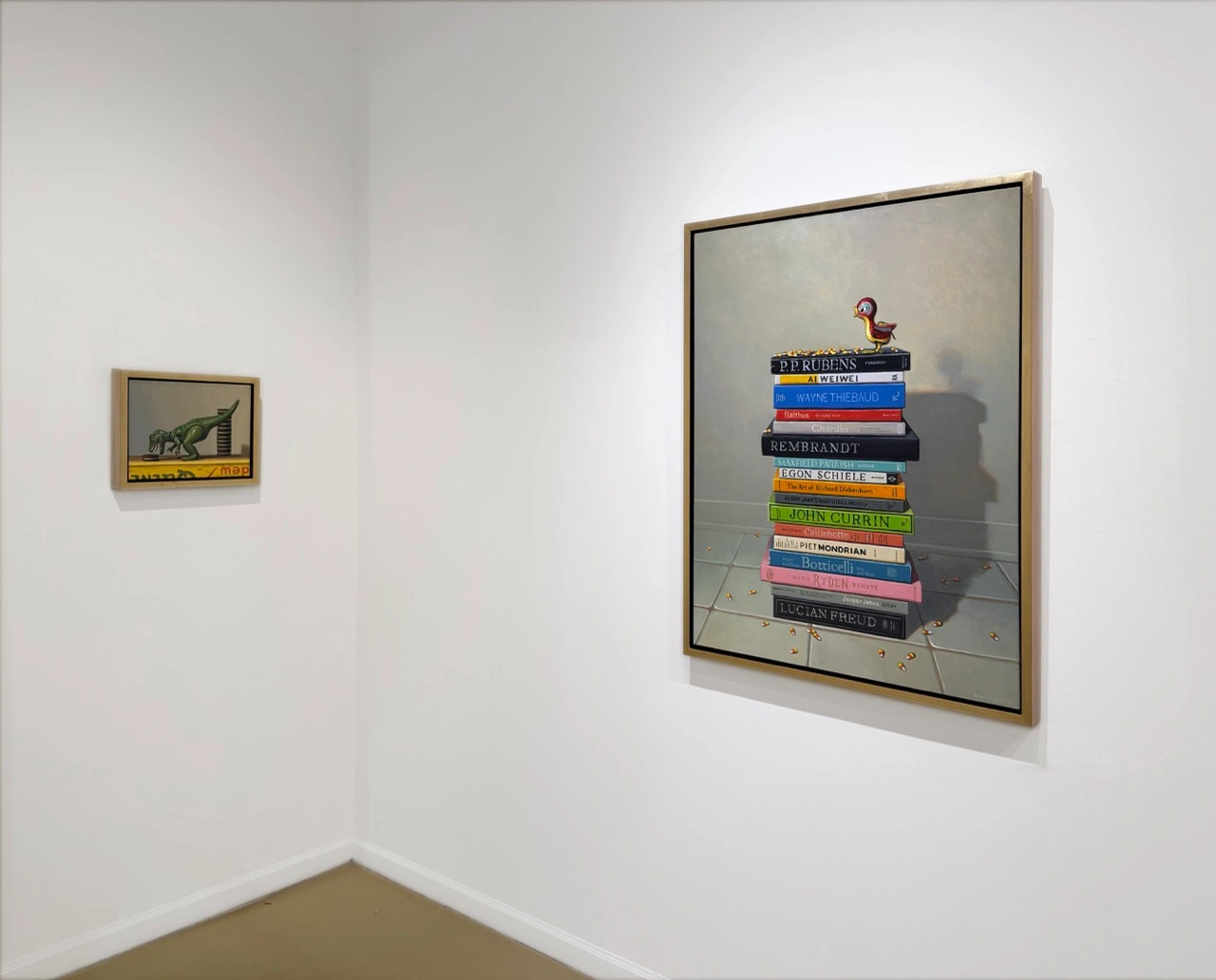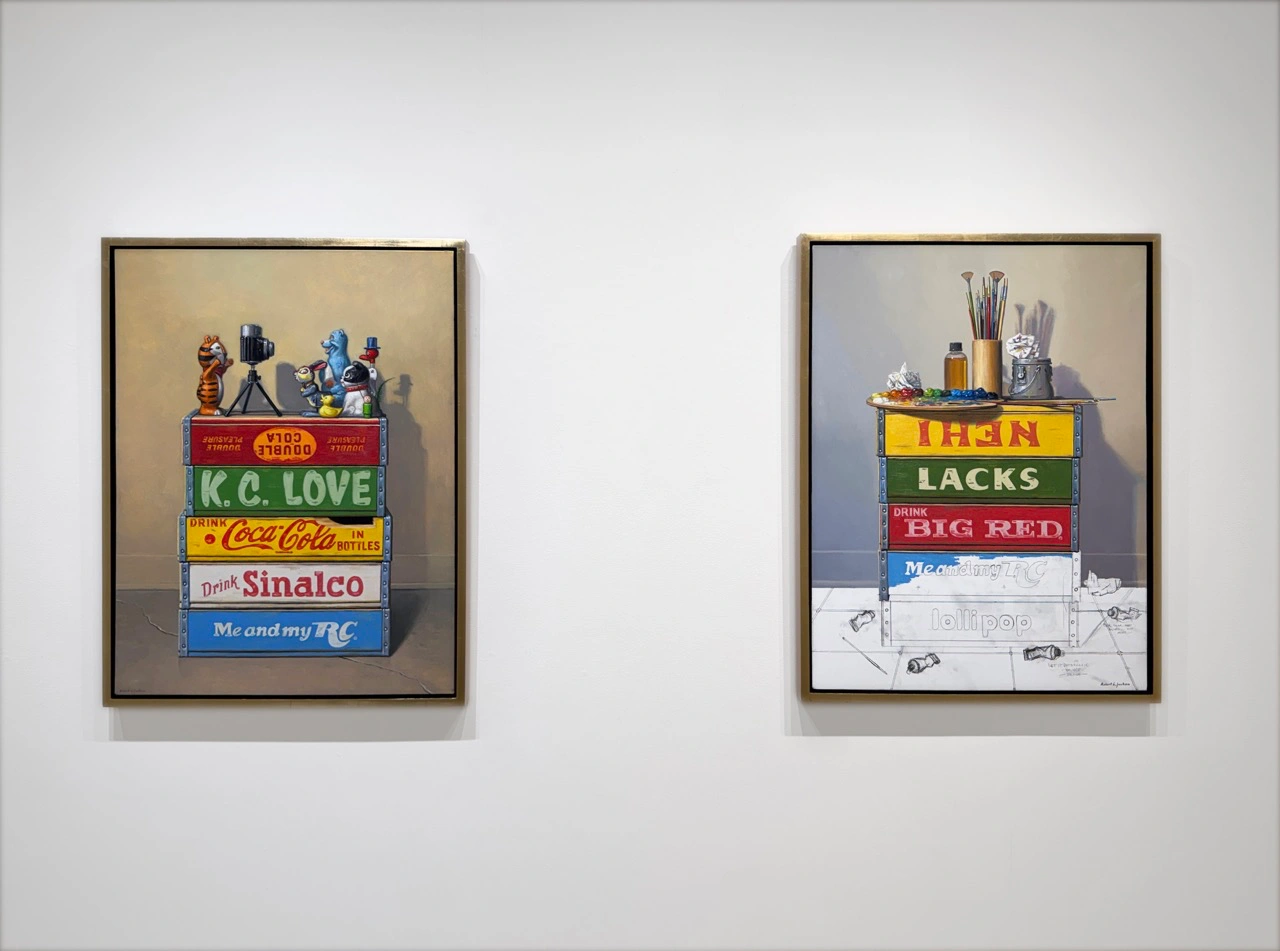 In this collection of paintings, Robert C. Jackson’s signature characters return to play a central role in the artist’s storytelling. Bringing forth entertaining new ideas, Jackson paints still lifes that brim with potential movement and witty punchlines. Scavenging through vintage stores for the perfect items Jackson says, “I’m a fan of nostalgia. I love leaning into the warm fuzzies that people get when they have a fond memory of something; those feelings help them connect to the messages in my paintings.” His soda box still lifes like Philosophy 101 and Always One highlight Jackson’s ability to meld comical figurines and elements with relatable situations.