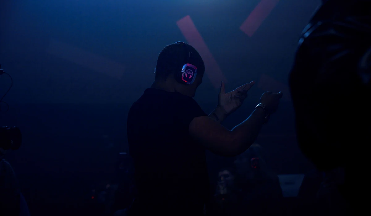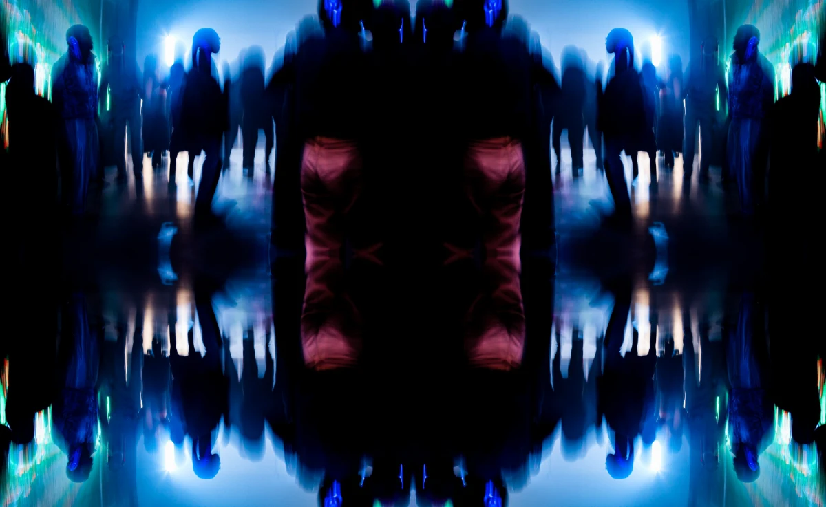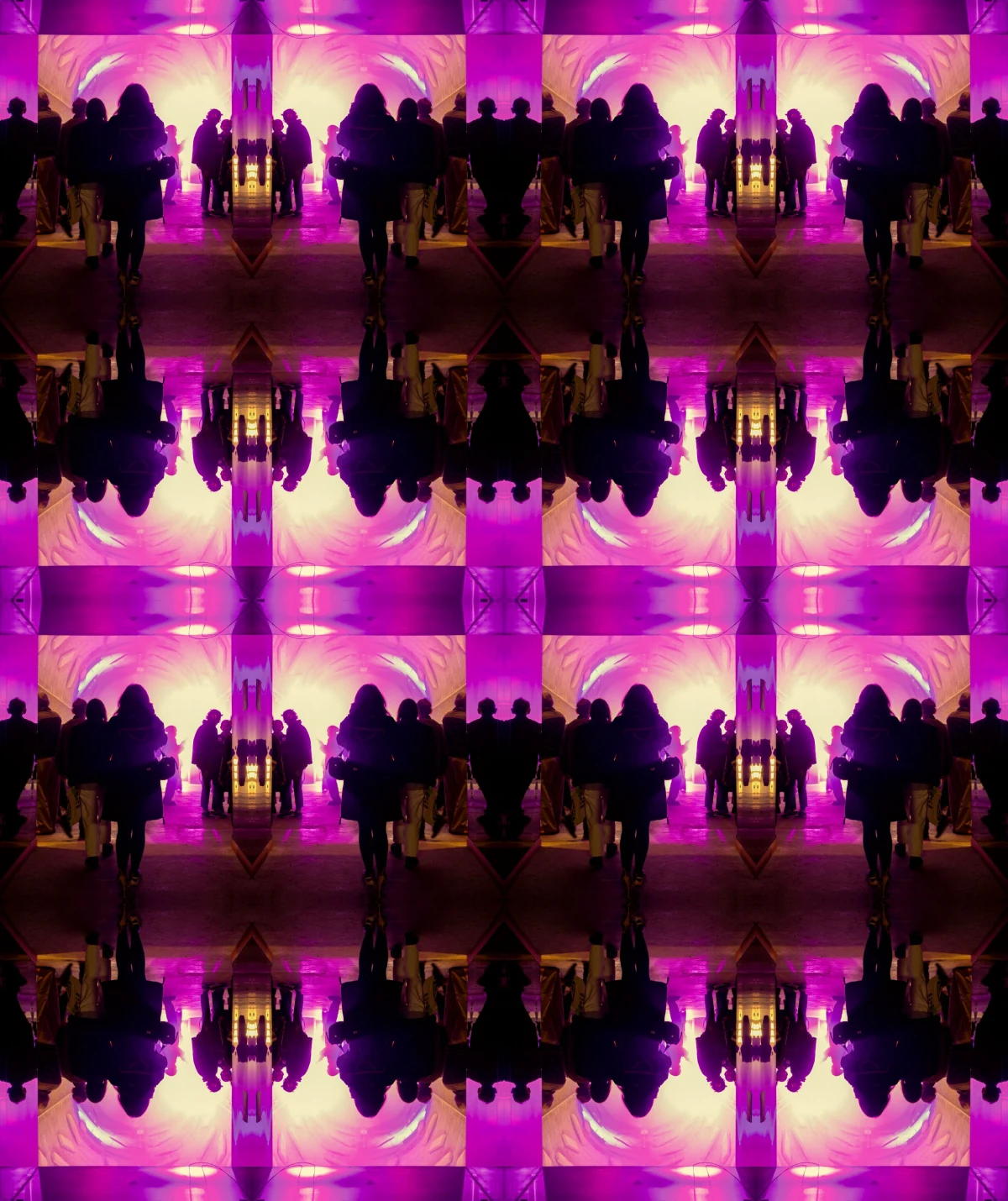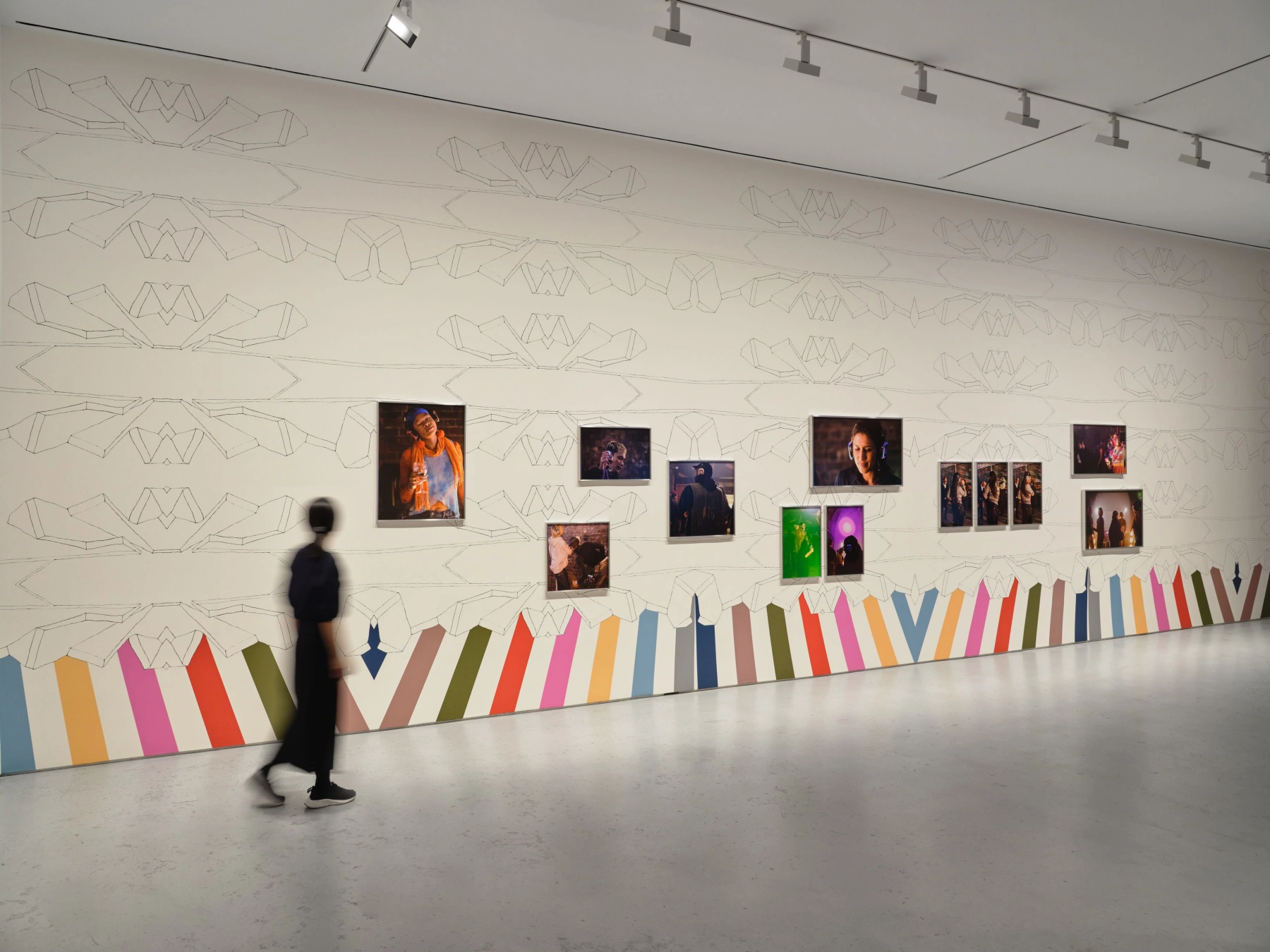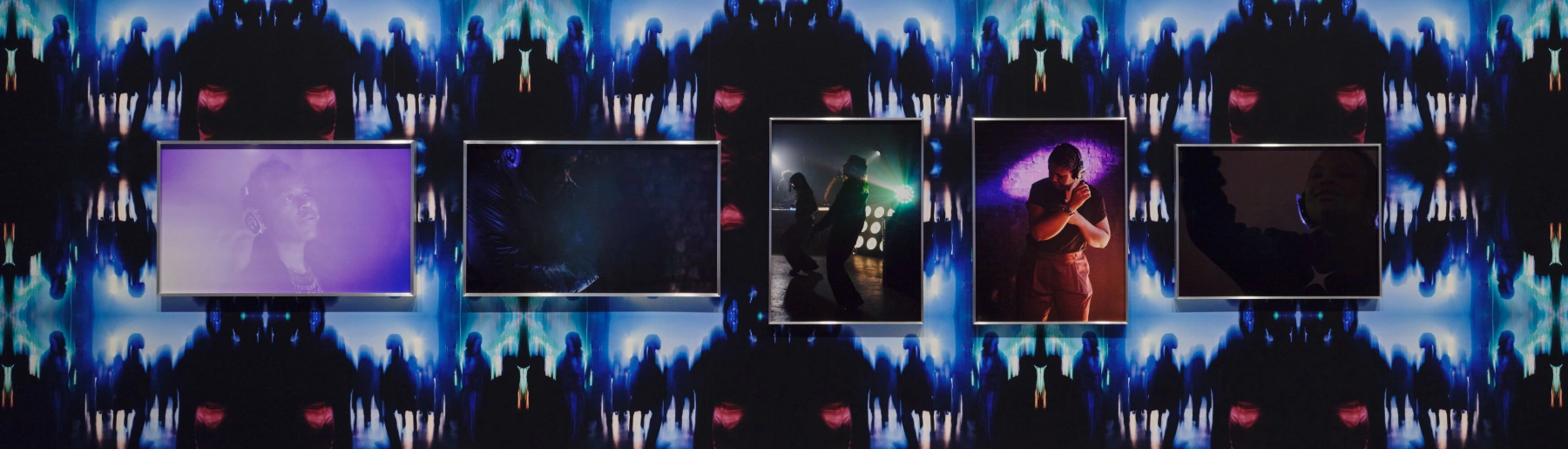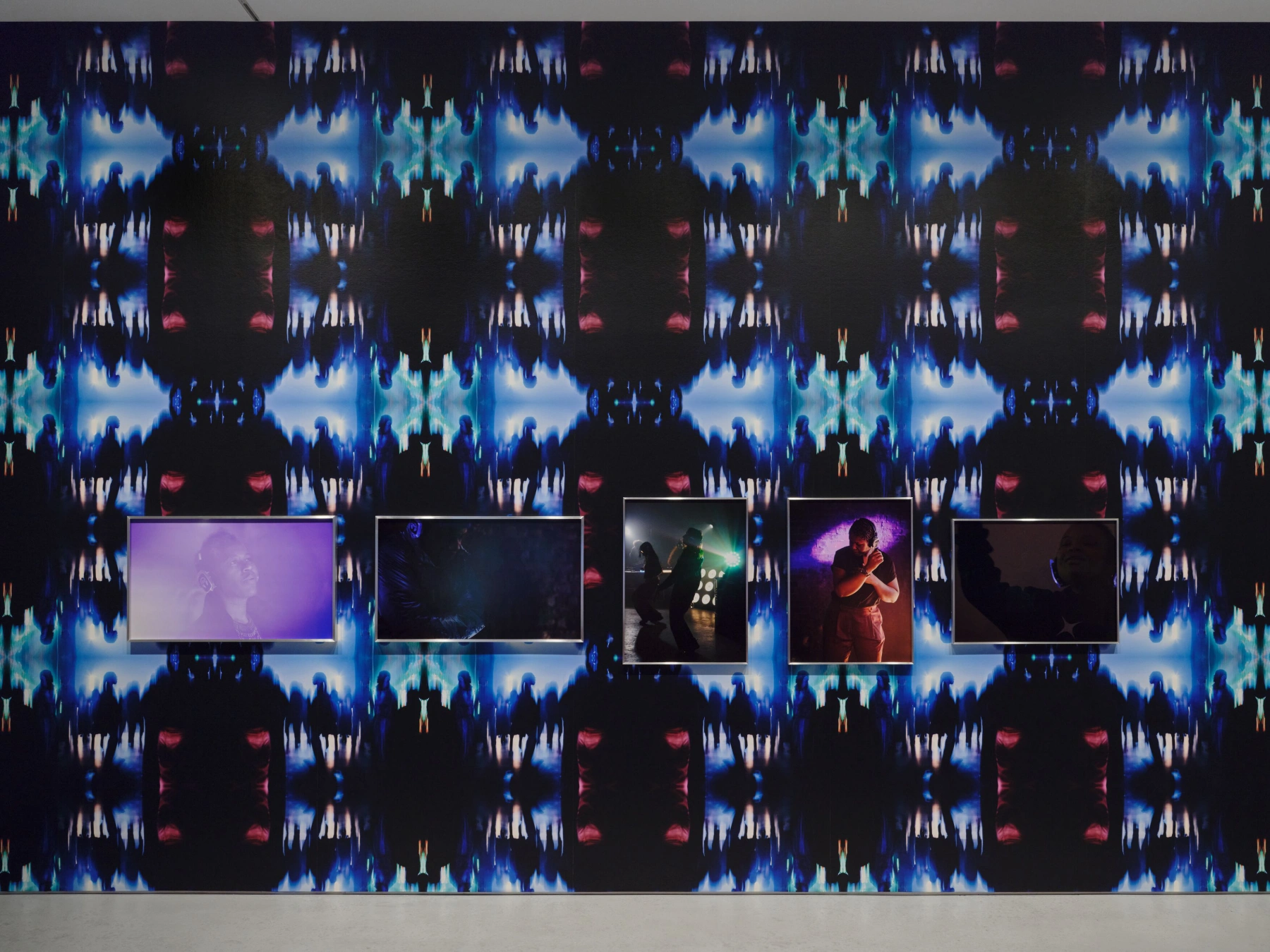 A key subject in Boyceโs recent work, the silent disco is not a party, but rather a framework for close listening, improvisation and collective performance. This sense of openness and play continues in the exhibition space itself. Boyce has taken still images from โSilent Discoโ and arranged them into repeating, kaleidoscopic patterns to create wallpaper installations within the gallery, blurring distinctions between the artwork and its means of production and display. Boyceโs installation immerses us in subtle cues from the original performanceโthe lights, the uncanny silence, the dancersโ whirling bodiesโsuggesting that at any moment, the disco could begin again.