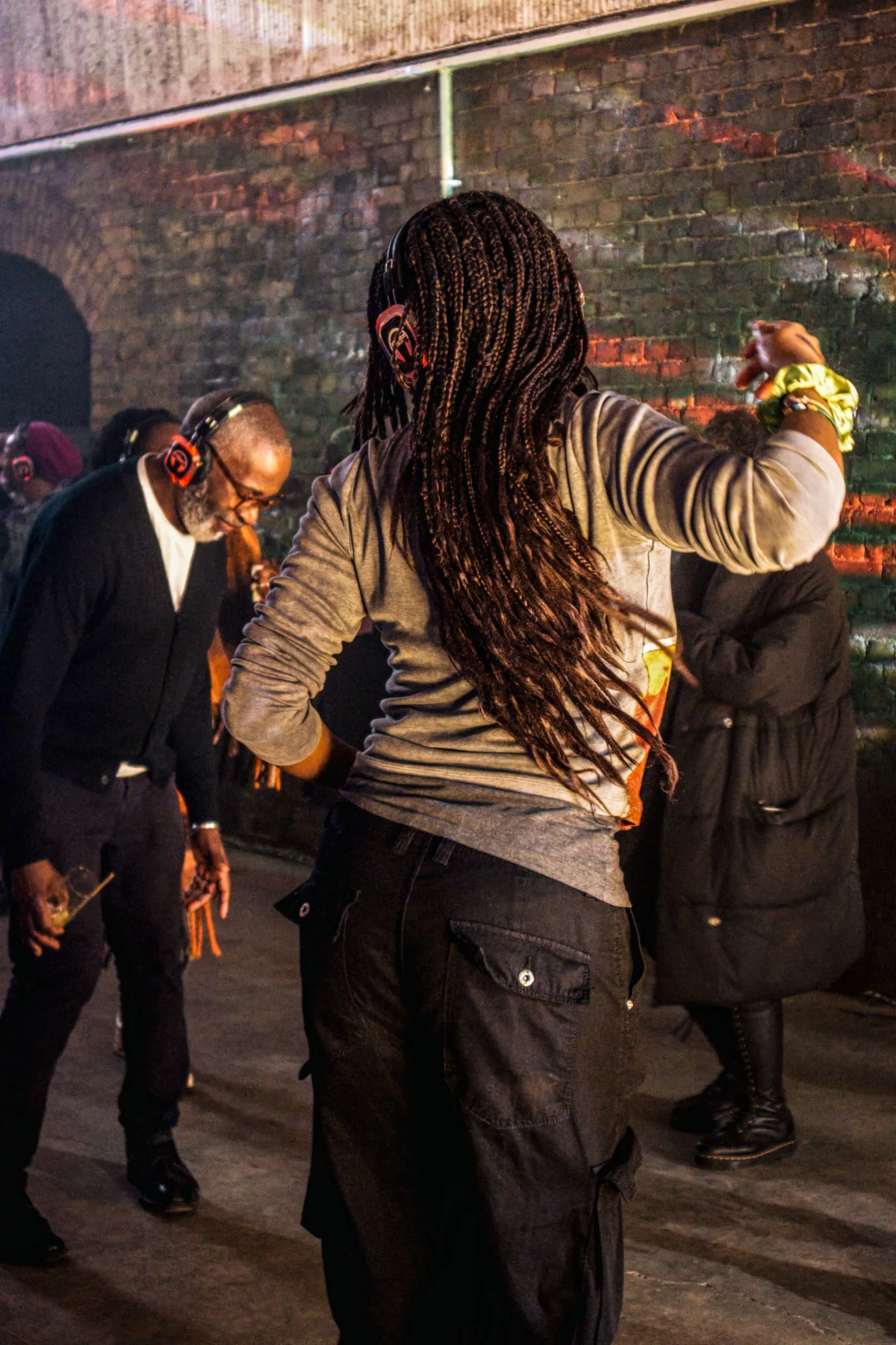 In the first film on view, Boyce weaves together footage captured at a silent disco, a paradoxically hushed event in which a roomful of dancers responds to music heard only through headphones. Inspired by both Roy DeCaravaโs โDancers, New Yorkโ (1956) and Adrian Piperโs โFunk Lessonsโ (1983)โgroundbreaking works by artists who have centered Black cultureโBoyceโs โSilent Discoโ (2025) revels in the dancersโ unguarded gestures, flickering emotions and ephemeral exchanges. Using montage and repetition, among other techniques, the film takes these lively impressions โfor a walk,โ as Boyce would say, quoting Paul Kleeโs adage (โDrawing is like taking a line for a walkโ). As the film begins, only ambient noises are audible to the viewer: we hear the soft shuffle of feet, train cars passing outside the venue, murmurs that erupt into sudden bursts of song. Gradually, the music builds, coaxing the dancers into collective movement, though their headsets are tuned to two separate channels. Harmony arises, improbably, from dissonance.