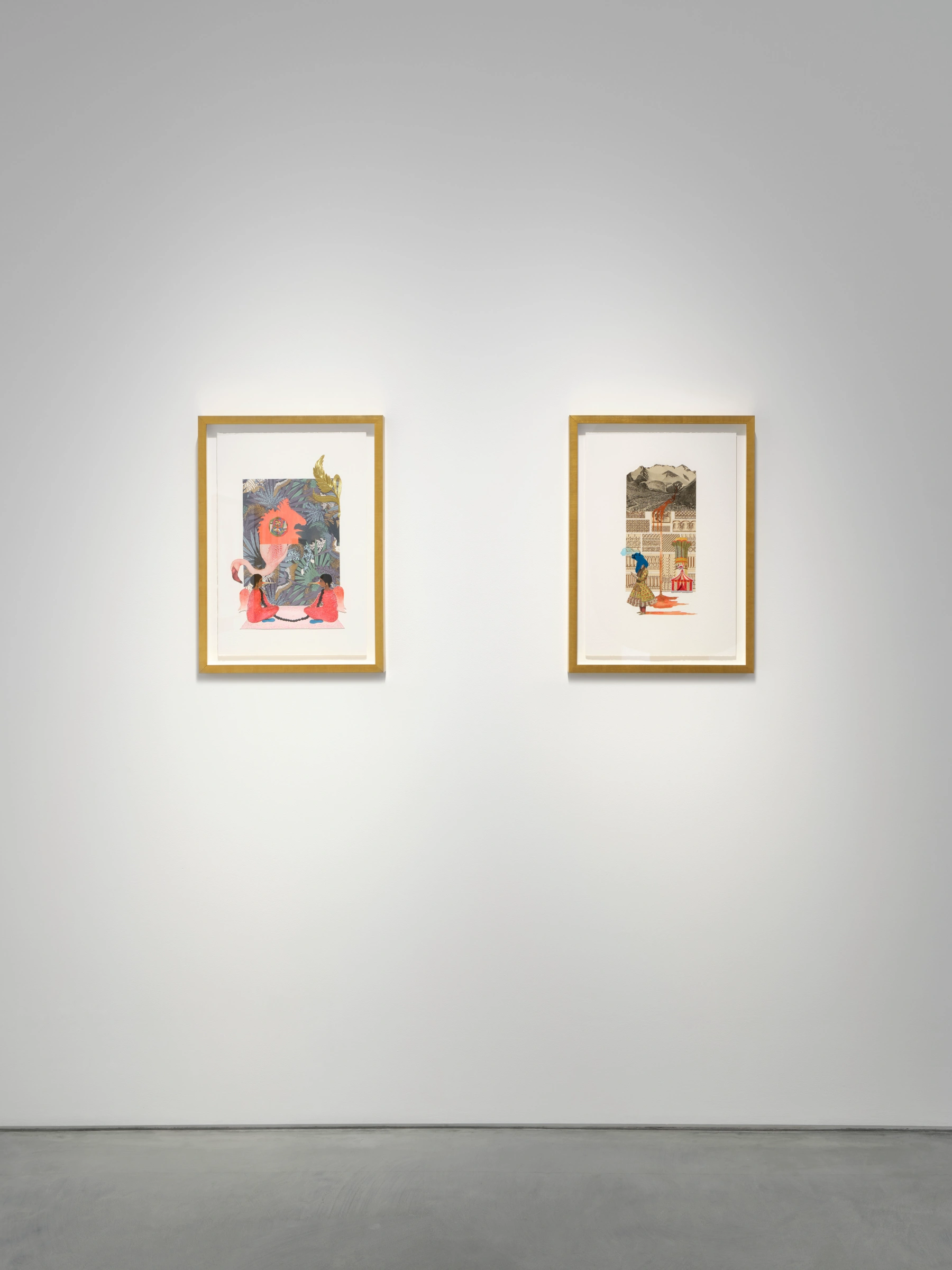 The use of narrative conventions has been central to Mattai’s process of reenvisioning her ancestral legacy, seeing them as repositories of historic meaning that can be reinterpreted and reimagined for the present. Mattai has looked to the history of fables—such as Aesop’s Fables and The Panchatantra in particular—for a conceptual framework to explore how society continues to make use of the character types and morally weighted meanings so often found in these stories. While still evoking the landscapes and architecture of European painting, Mattai’s collages interrupt those spaces and the formal implications they carry. This process of merging representational strategies which invoke a specific tradition of craft and artistry reflects Mattai’s broader project of considering how cultures have influenced one another through periods of migration.