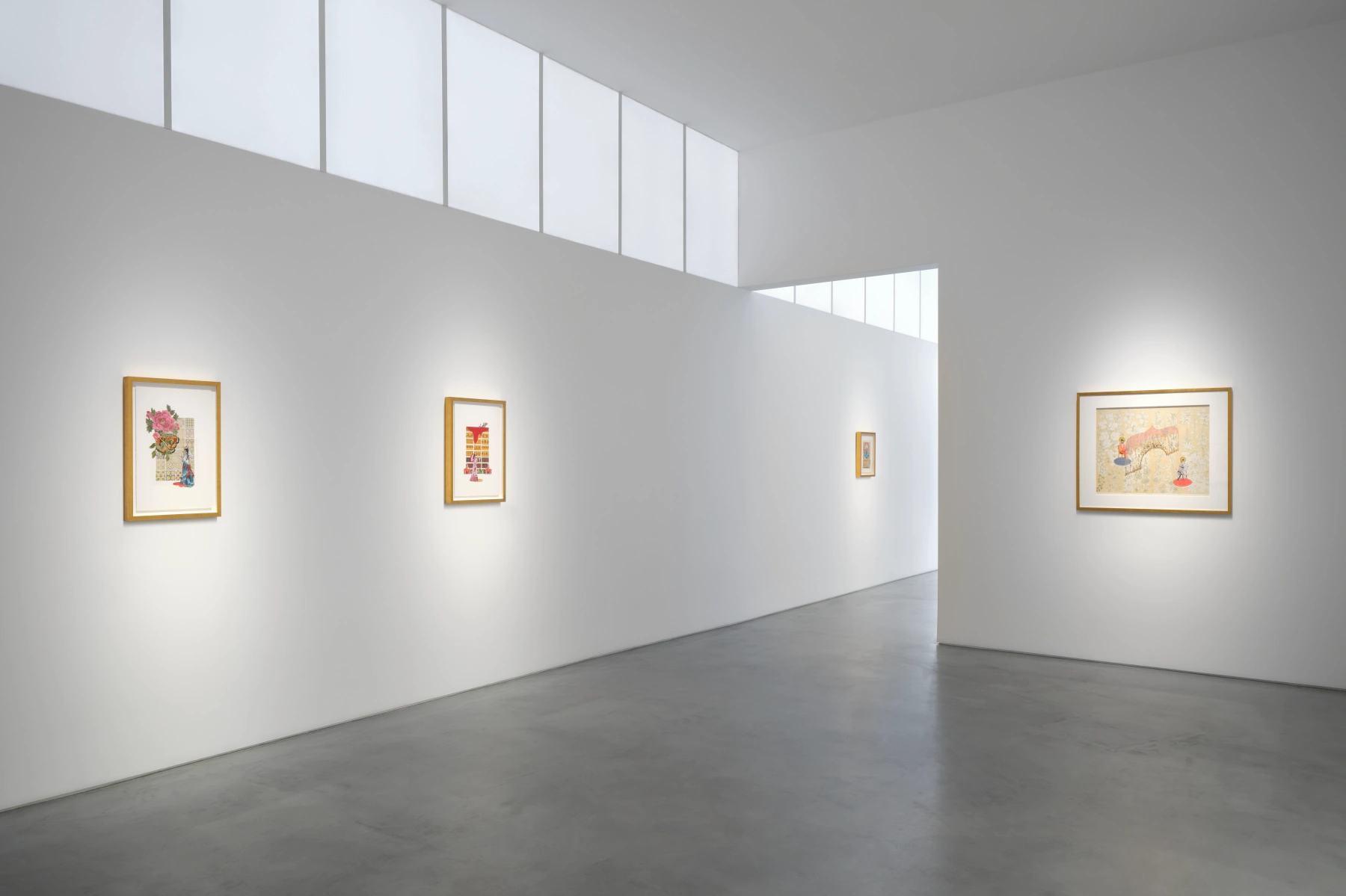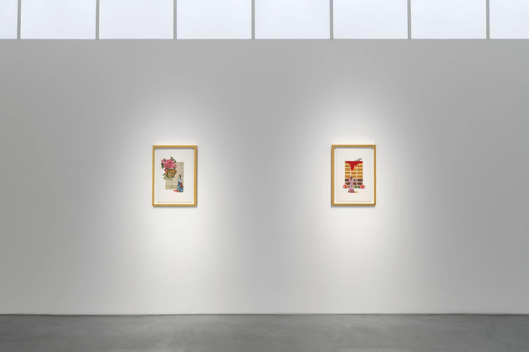 Drawing on her Indo-Caribbean heritage, Mattai’s multidisciplinary practice employs techniques such as embroidery, needlepoint and beading to create vivid and formally complex works that straddle the line between two- and three-dimensionality. In previous bodies of work, Mattai has made use of representational aesthetics from Indian miniature paintings while also referencing the subject and form of European pastoral landscapes and portraiture. Building upon this creative exploration, these works on paper also examine the history of ornamentation by sourcing examples from 19th-century academic volumes that represent the colonial practice of essentializing diverse cultures and traditions through a set of pictorial conventions. The process of collage allows Mattai to remain connected to the specific histories embedded within her materials—including pieces of embroidery, book pages and fragments of sari tapestries—while also attempting to unify them with new and inventive compositions.
