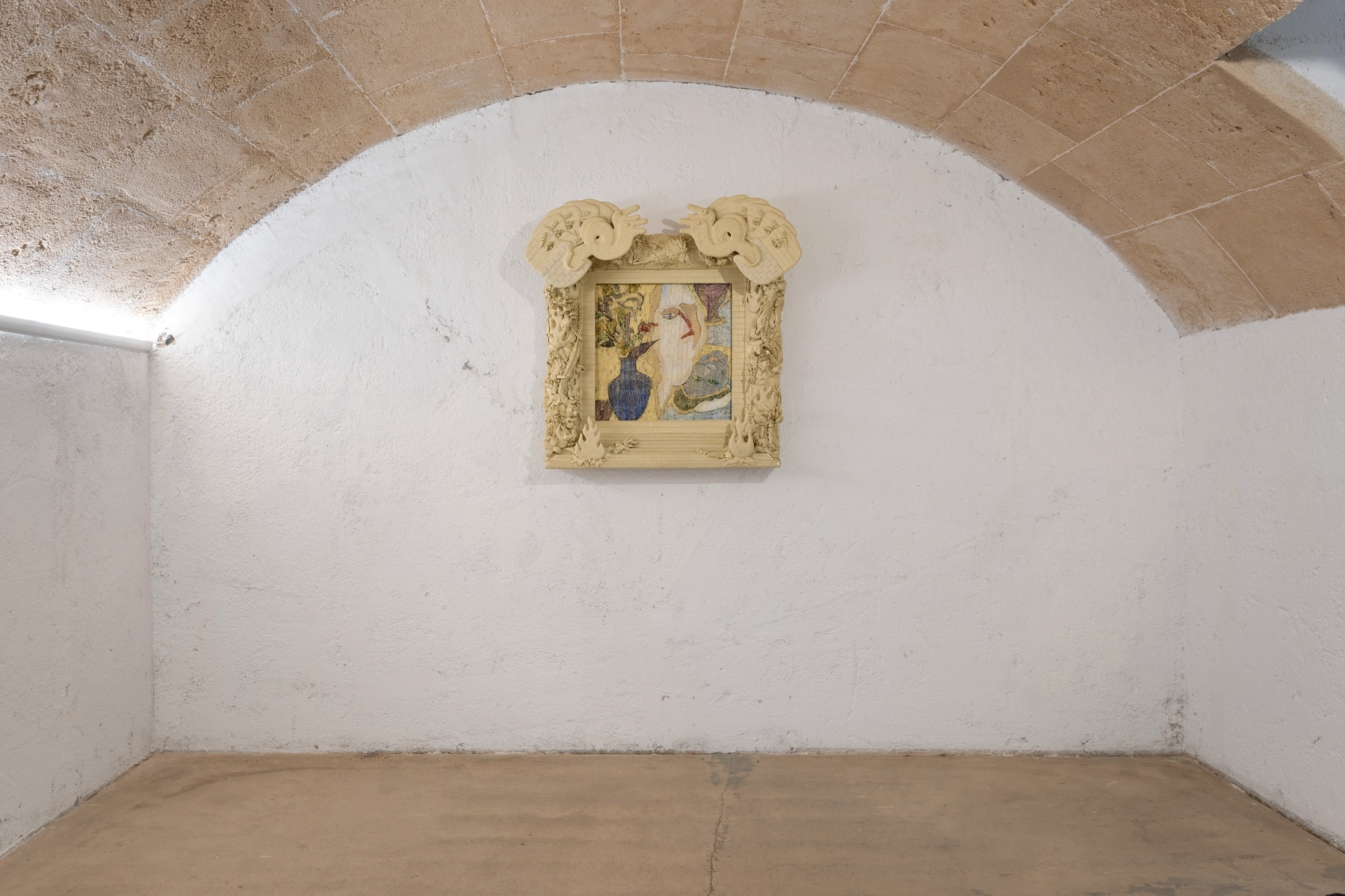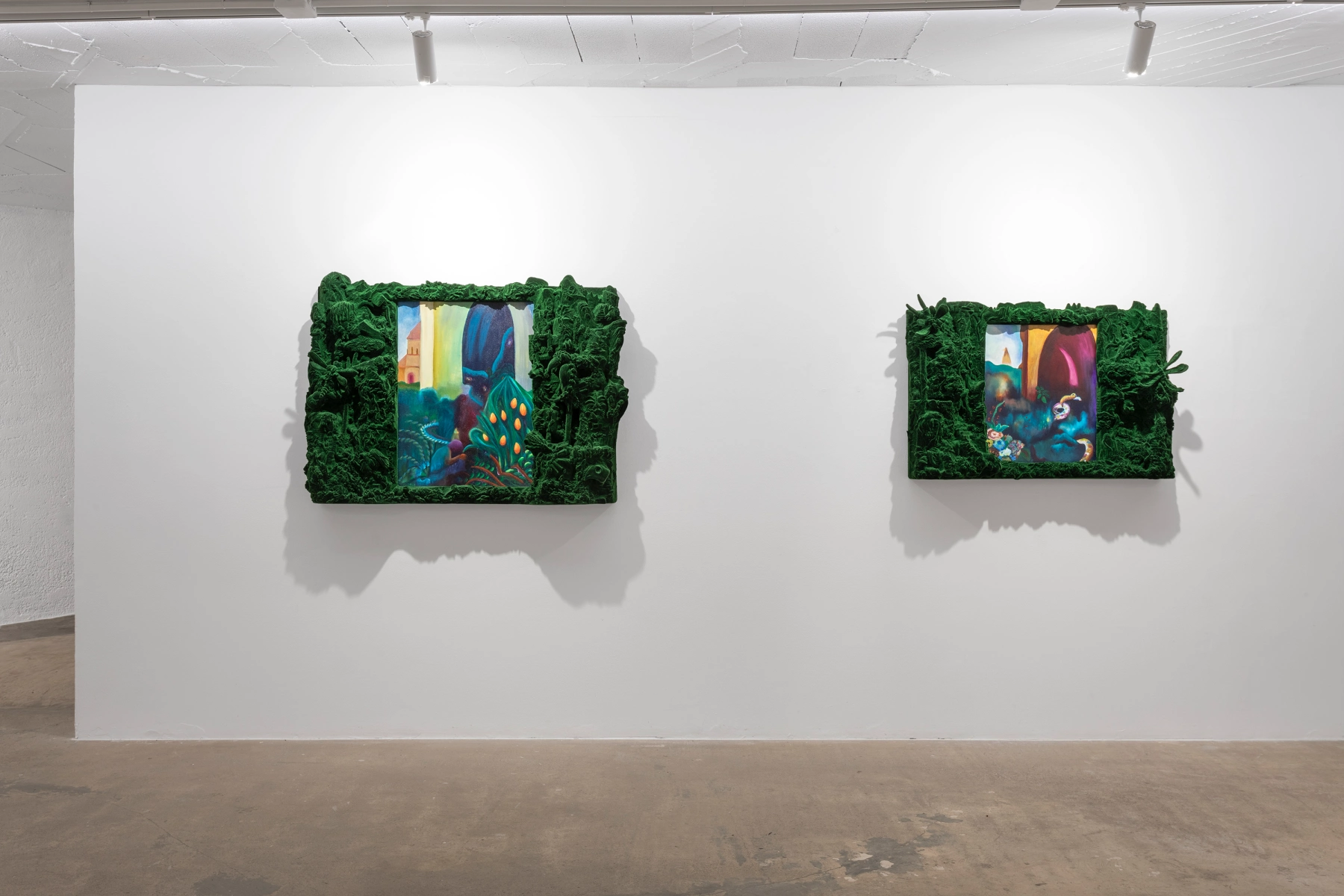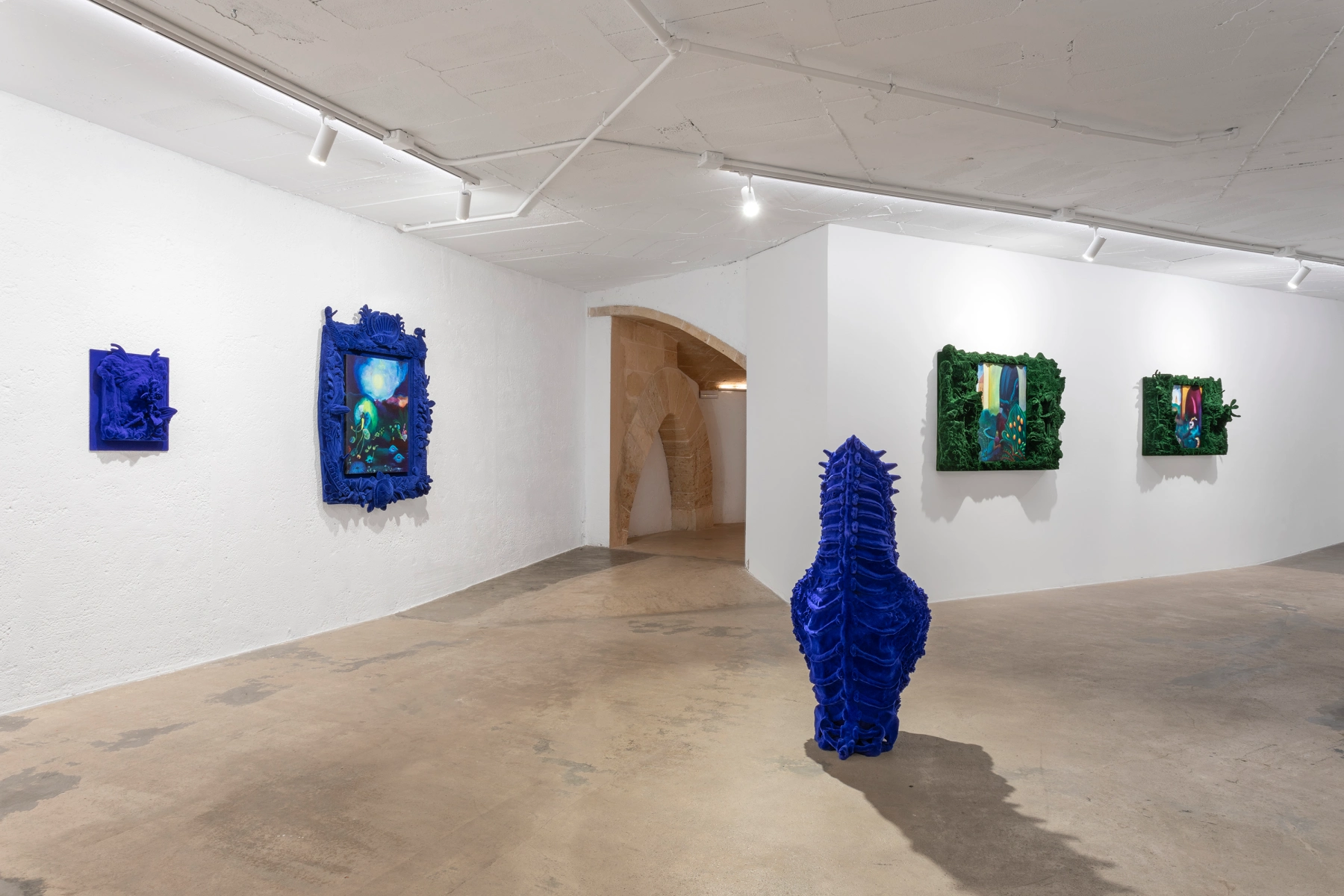 Materiality and tactility play a central role in the duo’s process. Velvet like flocked surfaces introduce shifting depth and a theatrical quality, while hand built epoxy clay forms preserve gesture and intimacy. Recurring tonalities, including deep royal blue, establish a cohesive atmosphere across the exhibition, reinforcing the dialogue between painting and sculpture and contributing to the installation’s scenographic presence.