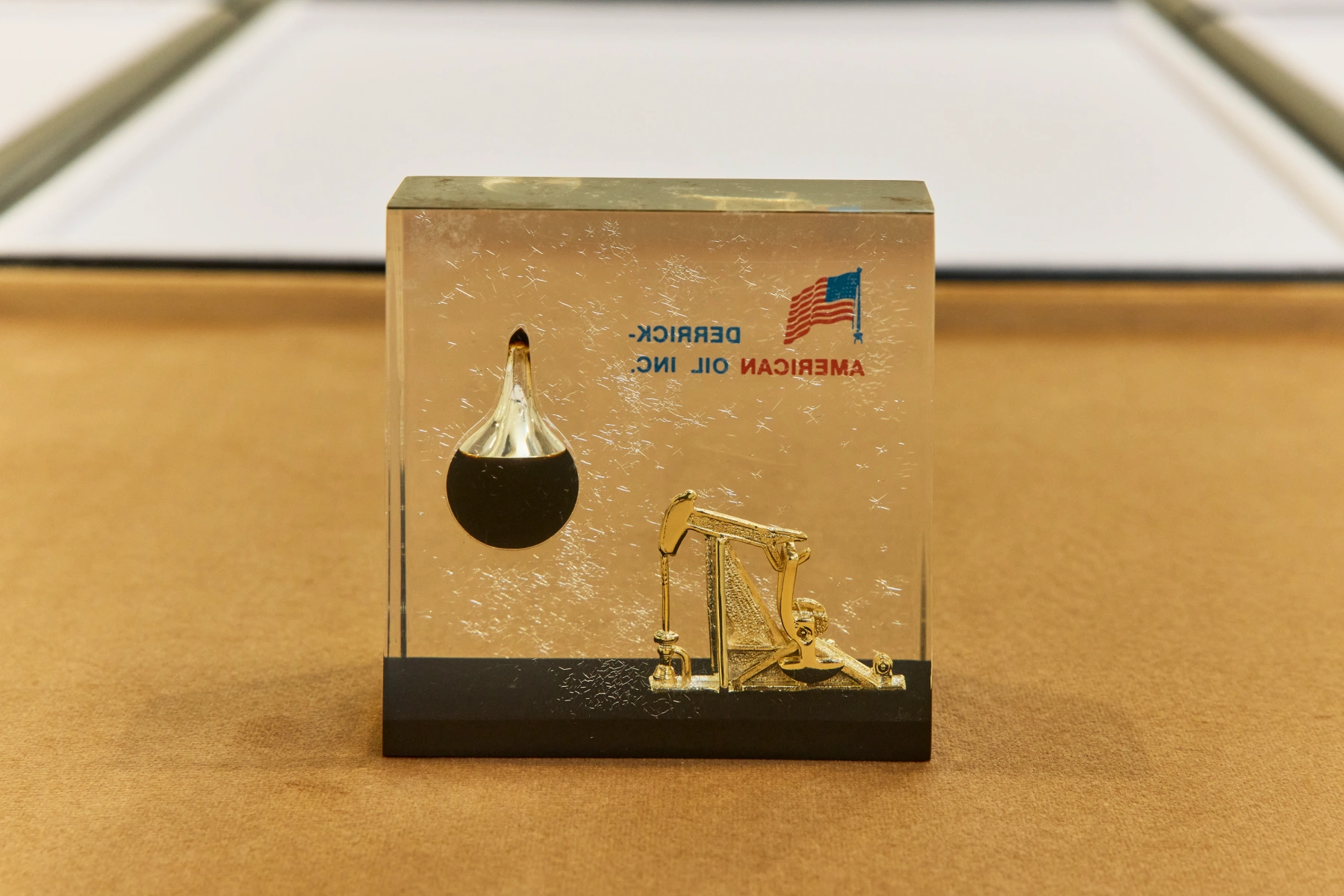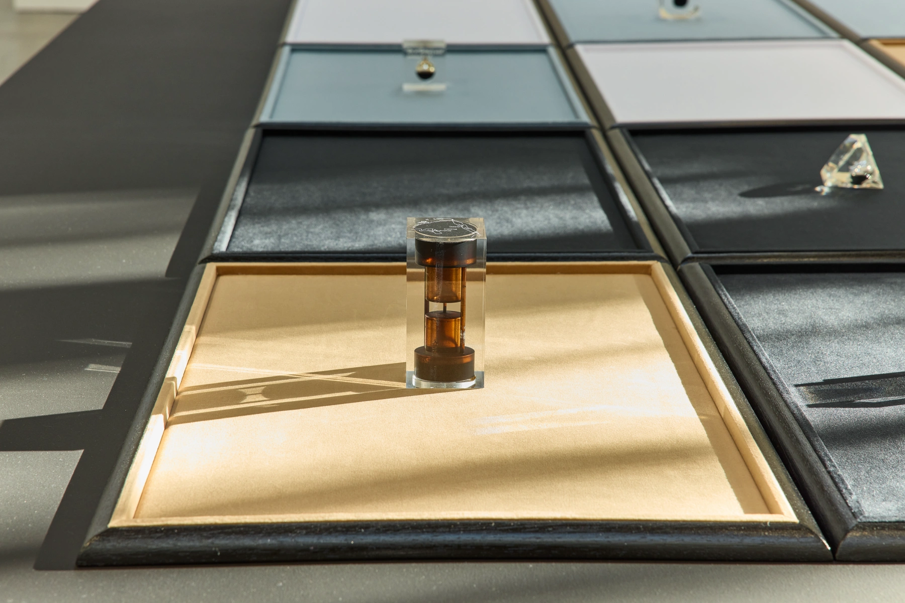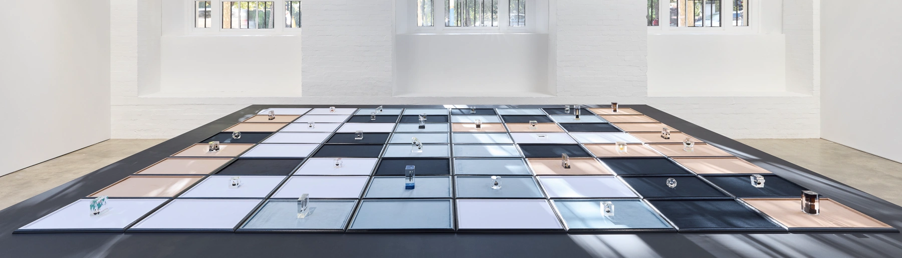 For this exhibition, Sasraku has collected a series of corporate trinkets in the form of paperweights produced by oil companies. These acrylic blocks each encase a small amount of crude oil sourced from extraction sites around the globe – from the snowy oil fields of Siberia and Alaska to the deserts of Texas and Saudi Arabia and the waters of the Scottish North Sea. The strange and highly designed objects boast slogans of success and picture their origin landscapes. Repurposed into a monumental, tiled display for the lower gallery, Sasraku reconfigures them within a conceptual chess game offering a meditation on extraction, pride, and empire.