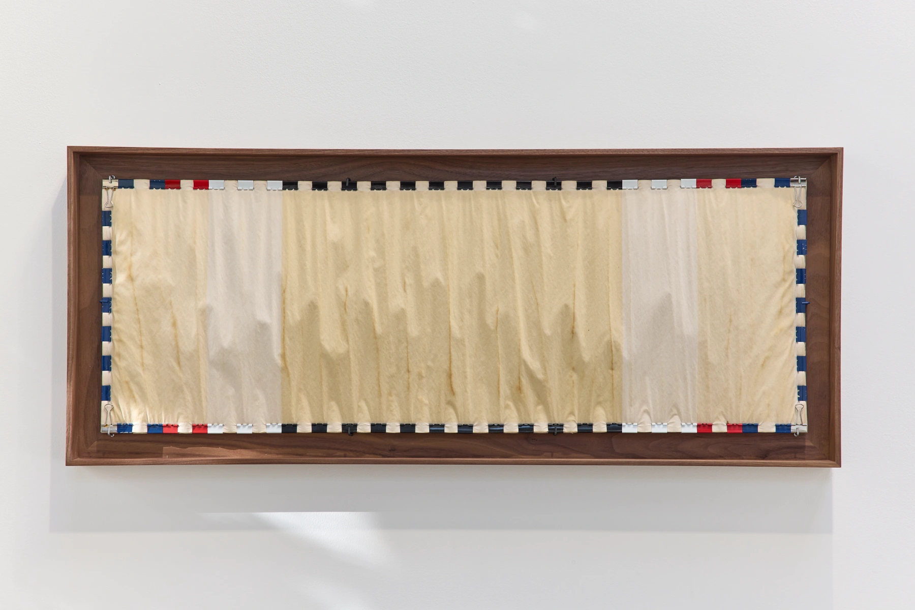 The largest of these works addresses the American flag. The iconic stripes (though not the stars) have been burned into the paper using UV light, creating an image that emerges from the natural tone of the newsprint itself. The image, like the material used to make it, is unstable: it will fade over the course of the exhibition.