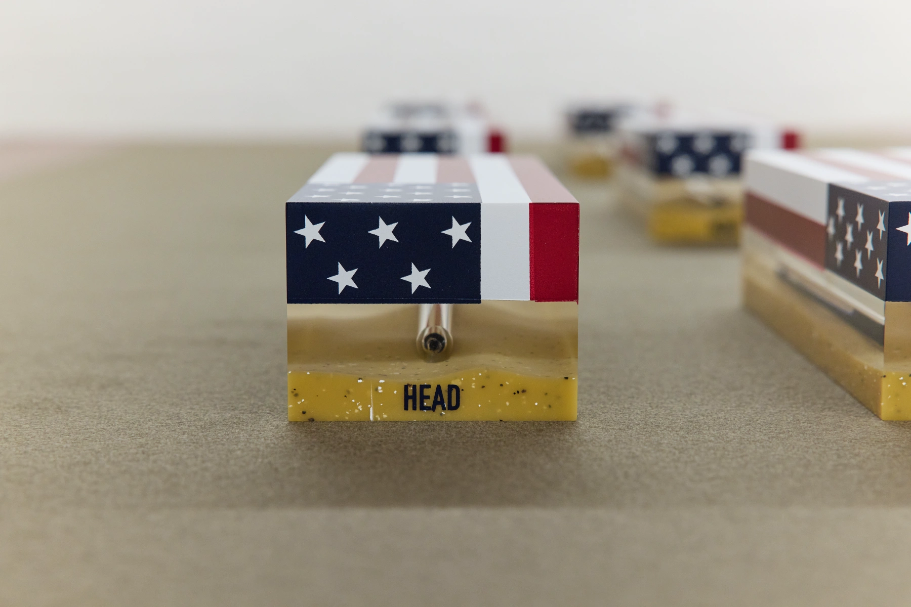 In the rear gallery, a series of new sculptures continue Sasraku’s enquiry into the intersection of oil and nationalism. Two sets of fabricated acrylic paperweights loosely resemble miniature military coffins. Each set references a site of war and/or oil extraction: one topped with a screen-printed Scottish flag placed over a North Sea landscape (Sasraku currently lives and works in Glasgow); another draped with an American flag laid across a desert terrain.