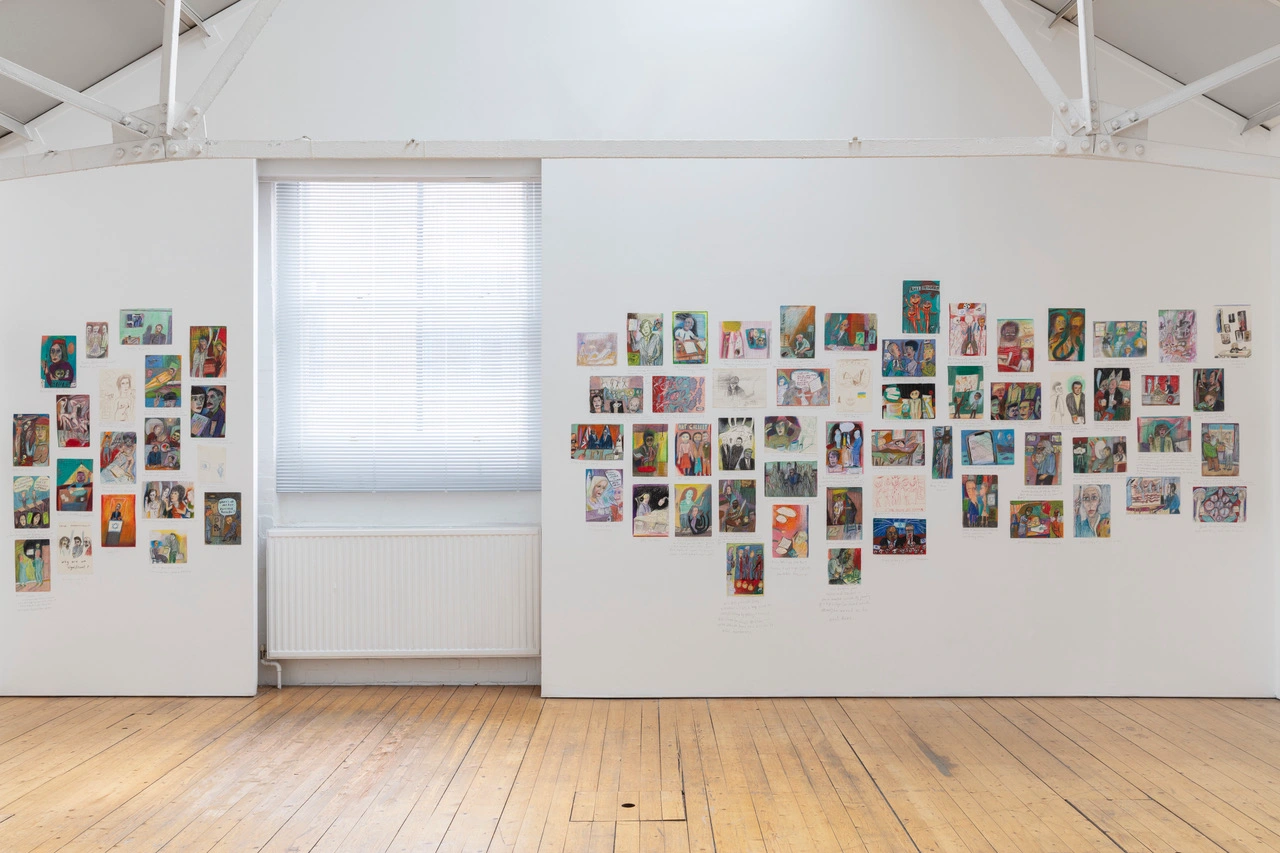As much paintings as drawings – the surfaces can be surprisingly impactful; and modern art tells us art can be anything, so a drawing can be a painting -- these works on paper question our preconceptions of art and history and their protagonists, placing the latter in unexpected and sometime humorous situations. The works address our understanding of cultural transmission and the influence of images and text across time and space. Cultural memory and the impurities that memory acquires, become material like paints and colours. Psychology, dreams, the soul, become the same as knowing the isms of art. A recurring cast of about twenty sacred cows from Philip Guston to Hilma af Klint, plays out scenes in which anyone might appear. British royals, the IDF, Jesus, authors, poets, the Beatles, Nico, Nietzsche. This world of history is factual and public and well known, and it is our psychic mothers and fathers, and the manufacturer in the form of art of a fulfilled version of our dreams and desires. Matthew’s own real mother often makes an appearance. They both went to mental hospital when he was six for observation for psychosis. She was mad as a hatter and had ECT, and he was sent to a children’s home for seven years. Then he was kidnapped to Canada when he was fourteen and brought back by Scotland Yard after a worldwide police search involving Interpol and the FBI. Philosophical wonderment at the workings of the mind, and art-critical sly appreciation of the whole span of art forever from the year dot to neoliberal art fairs, with a certain amount of blasé, frivolous laughter, became Matthew’s destiny as an adult. Now, entering his seventies, he’s an artist with a beard selling thousands of drawings a year on Instagram. Such is life -- as Ned Kelly is reported to have said, who Matthew has drawn many times being painted by Sidney Nolan – on the scaffold before he was hanged.