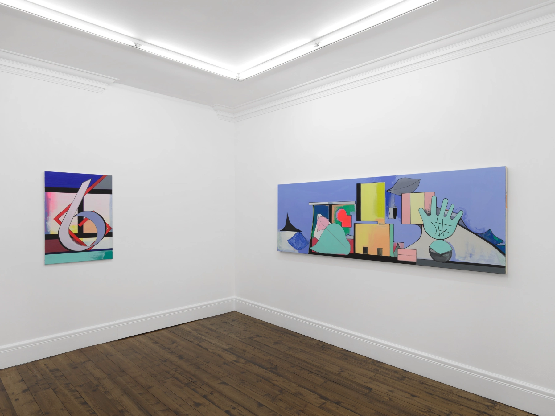 Helle Schatten (2026), which translates as bright shadows and gives the exhibition its title, embodies its premise directly. The large white teardrop at the painting’s centre reads simultaneously as a light source and a void, held by the same black contour line that defines and binds every other colour field. Gebiet (2026) unfolds as a wide, frieze-like arrangement of borrowed forms across a bright blue ground: architectural fragments, a hand with scored lines that could double as a sculpture, a leaf, a house reduced to its barest outline. Each element arrives from a different register of visual experience—symbol, sign, body, building—without narrating or explaining the others.