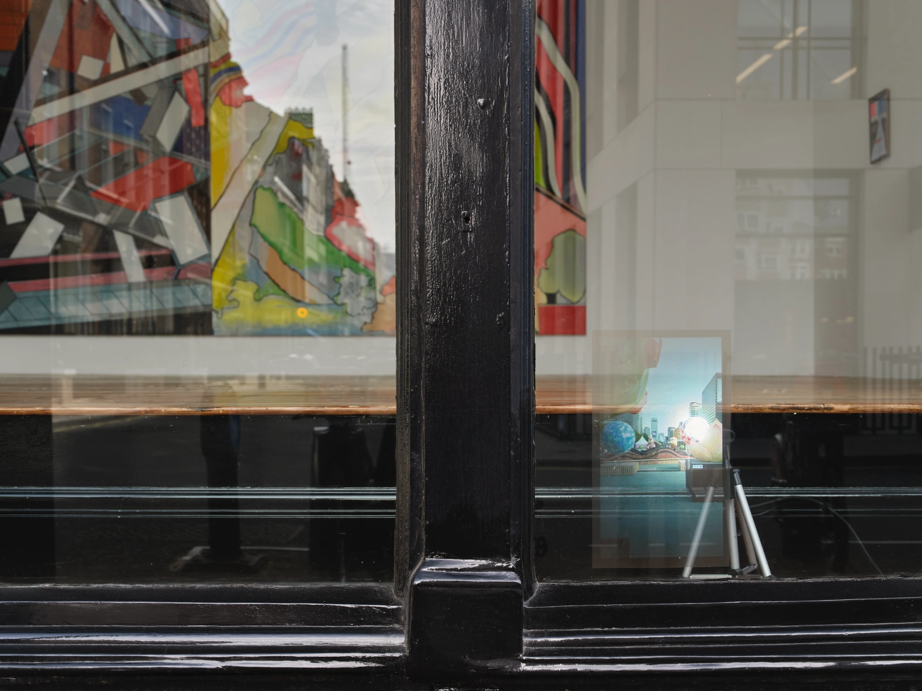 The large-scale OSO (2017), visible through the gallery’s Georgian shop window, weaves together disparate elements and visual planes, layered like stage sets, some in harmony, others in deliberate tension. The title stands for Ost-Süd-Ost (east-south- east), an intermediate point on a traditional compass largely superseded by modern navigation. It names a direction that is still precise but no longer in common use, suggesting that the frameworks by which we locate ourselves are never fixed but always historically contingent. The work gestures toward a broader uncertainty about stable meaning.
