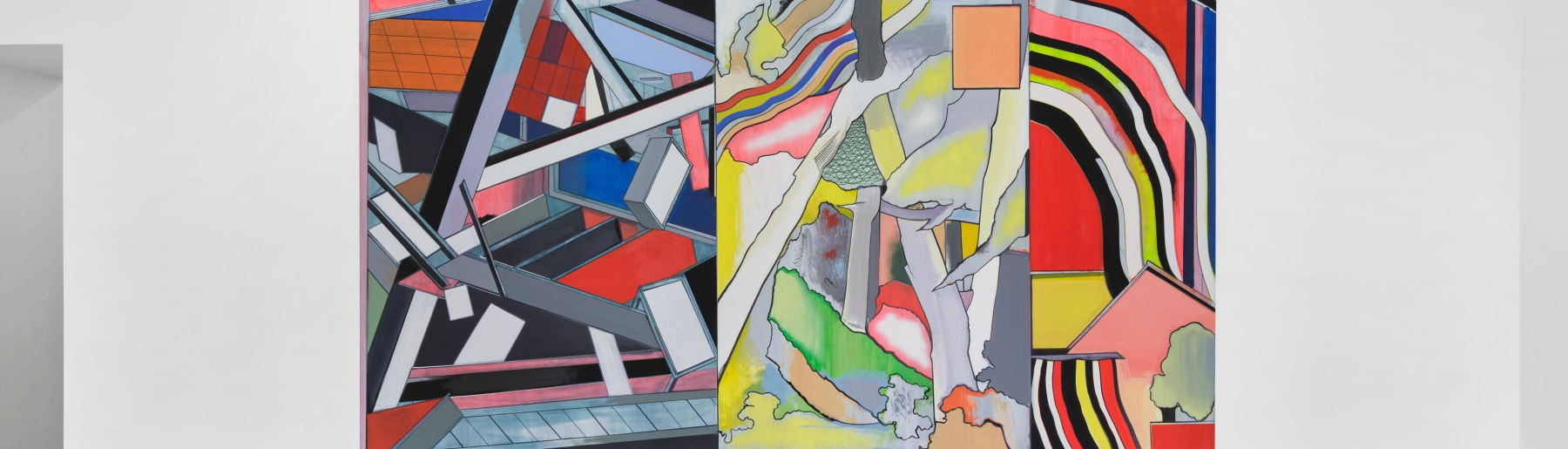 Alongside the paintings, several sculptures carry the same concerns into three dimensions. Kirche (2023) takes as its starting point the Heddal Stave Church in Norway, which dates to the thirteenth century and is the largest surviving of its kind, characteristically distilling it into spare geometric form. The work is organised around tectonic relations—the way surfaces, spaces and formats negotiate with one another. The angular, roof-like forms of the base push outward in multiple directions. Above this, the volumes shear and lean against each other at oblique angles, making the logic of bearing and support the actual subject of the work. Brushily painted in acid yellow, it presents itself less as object than as a model of structural thinking made physical. Other sculptures on view share this quality: spectral in character, they hover between object and sign, resisting easy reading as insistently as the works on canvas.