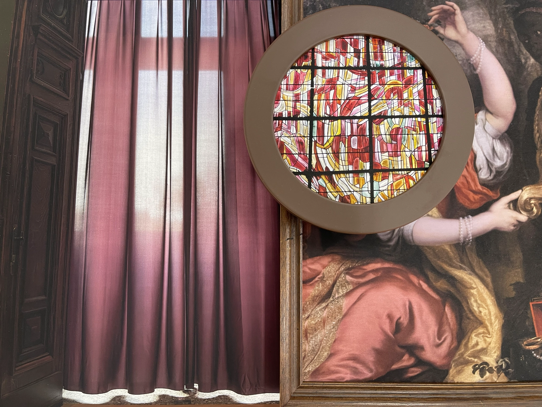 The exhibition’s title underscores these visual strategies. Derived from portalis, meaning doorway or threshold, a portal is an in-between space—not a destination but a point of entry, a connector between different realms or states of being. In Past Imperfect (promise of amnesia), the classical façade of Sanssouci Palace in Potsdam Germany appears to open onto verdant wetlands in Nigeria. In Kind of Blue in a Silent Way an image of the cosmos captured by the Hubble Space Telescope is paired with a mural from Fort Apollonia in Beyin, Ghana, along with a naked silhouette of Gray, and a stained-glass window from the Church of Saint-Séverin in Paris.