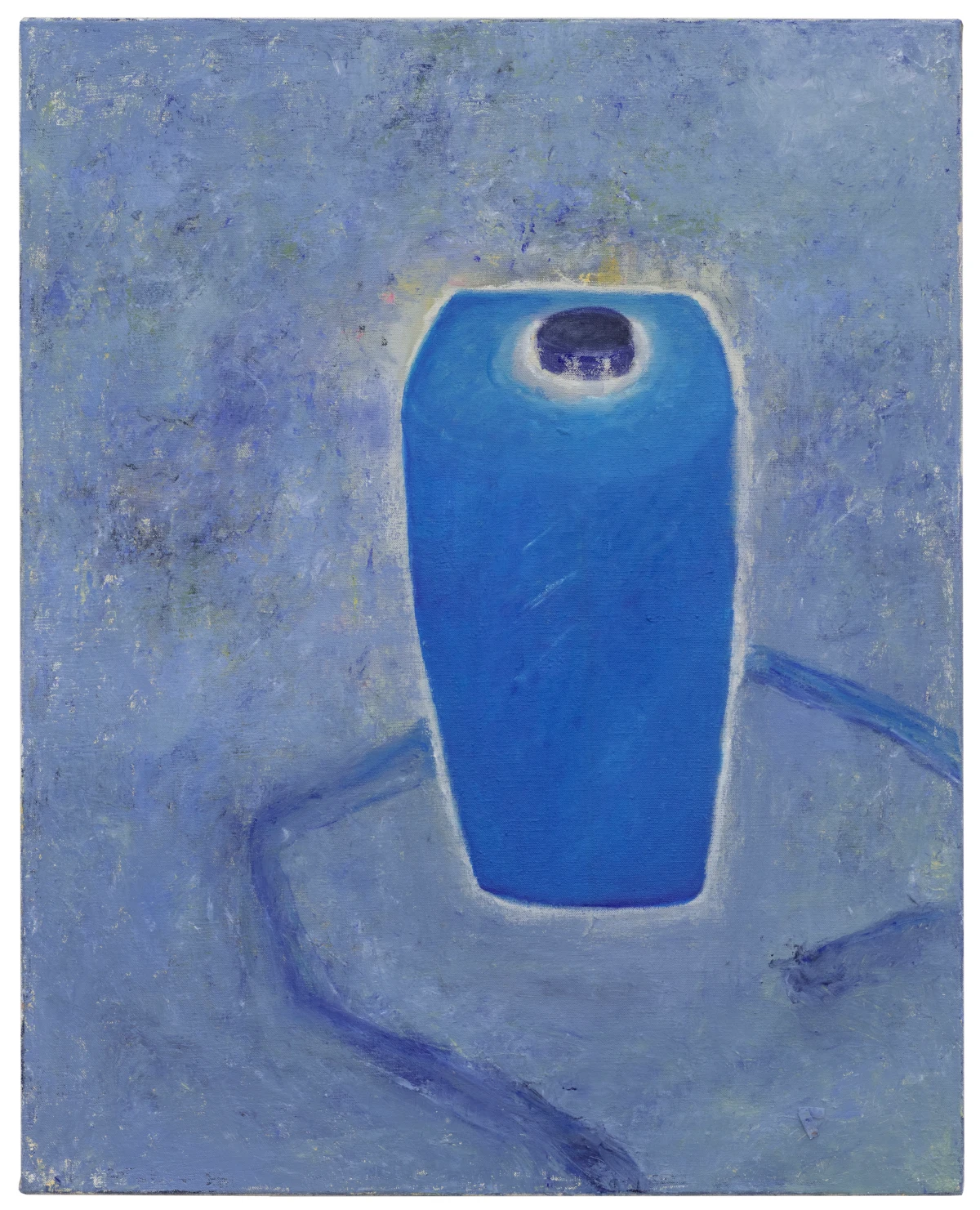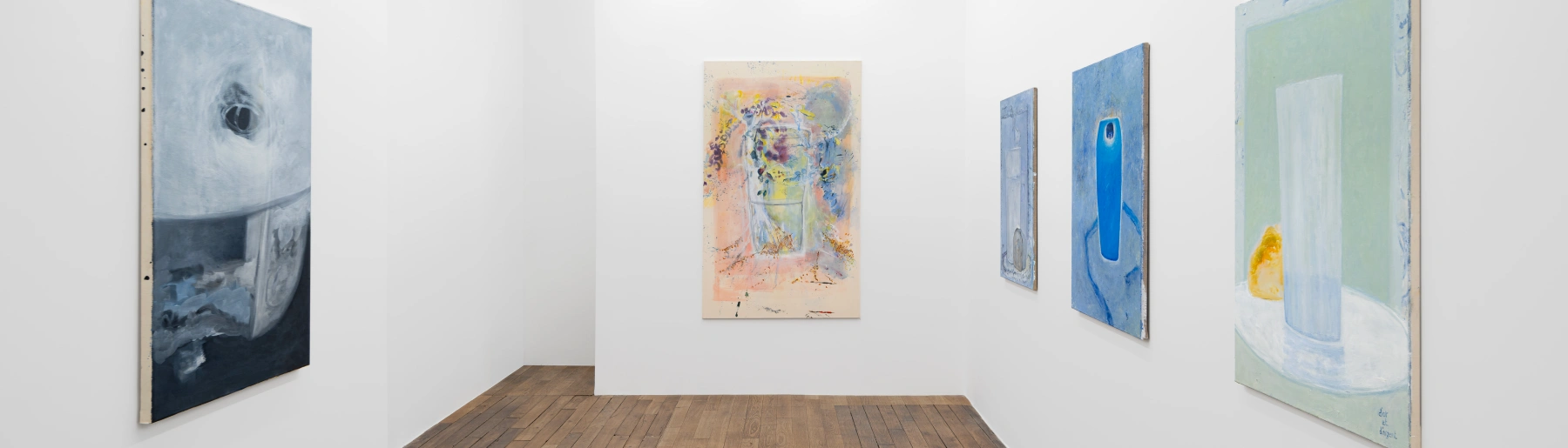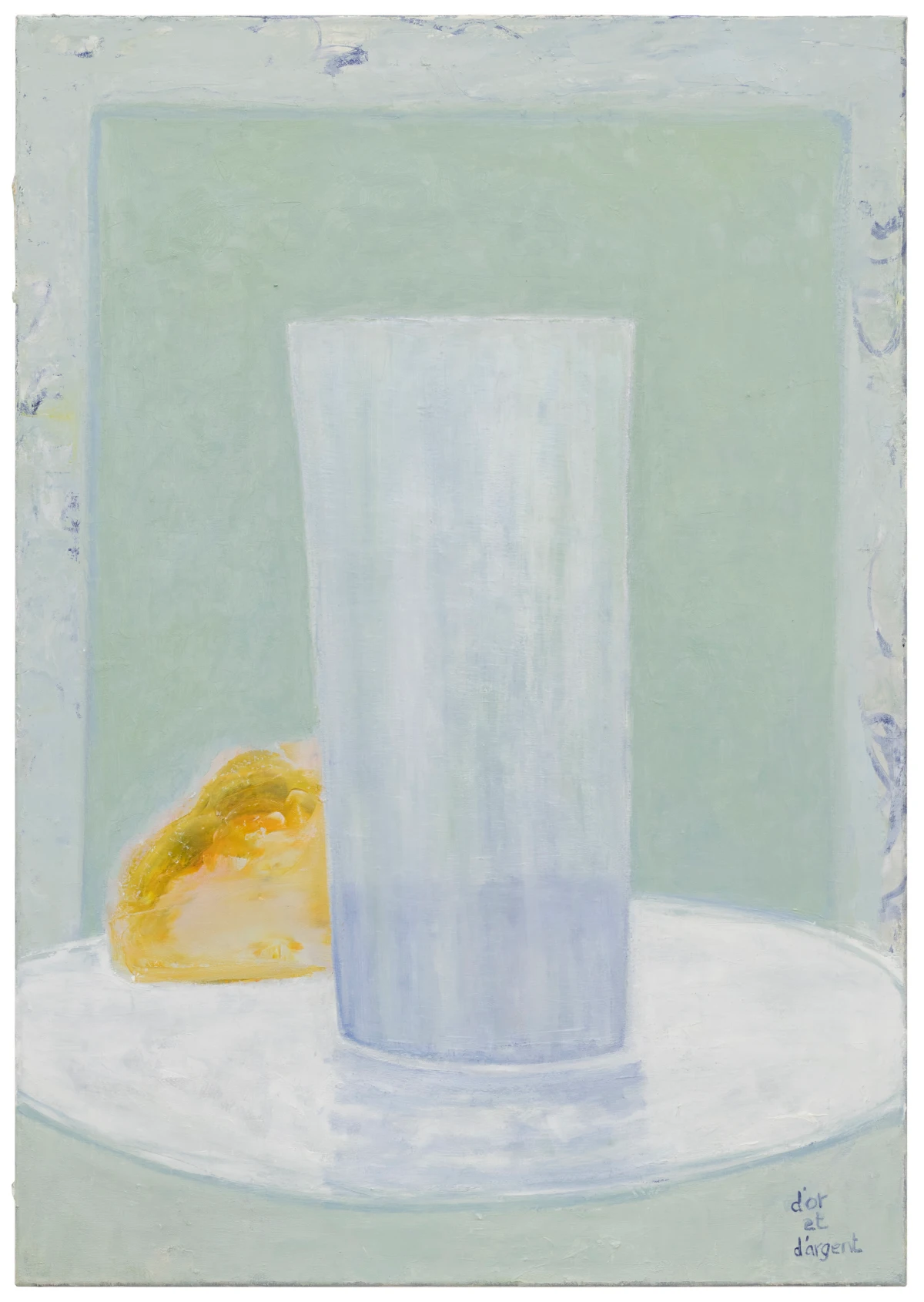 Even the glasses in the still lifes D’or et d’argent appear to hold a promise. In these new paintings, the vessels encounter the viewer as actors. This is less an academic exercise than a political manifesto. Sometimes filled, sometimes empty, with the loaf of bread positioned before or behind them, this modest, discreet pair of water and bread—essential sustenance—means more to the artist than gold or silver. This sense of calm is further enhanced by the grey or blue background and the decor reduced to its essentials. In this way, the viewer is presented—with a touch of nostalgia—with the image of a breakfast, lunch, or dinner table: a natural, comforting table, entirely in keeping with the ethos of her work.