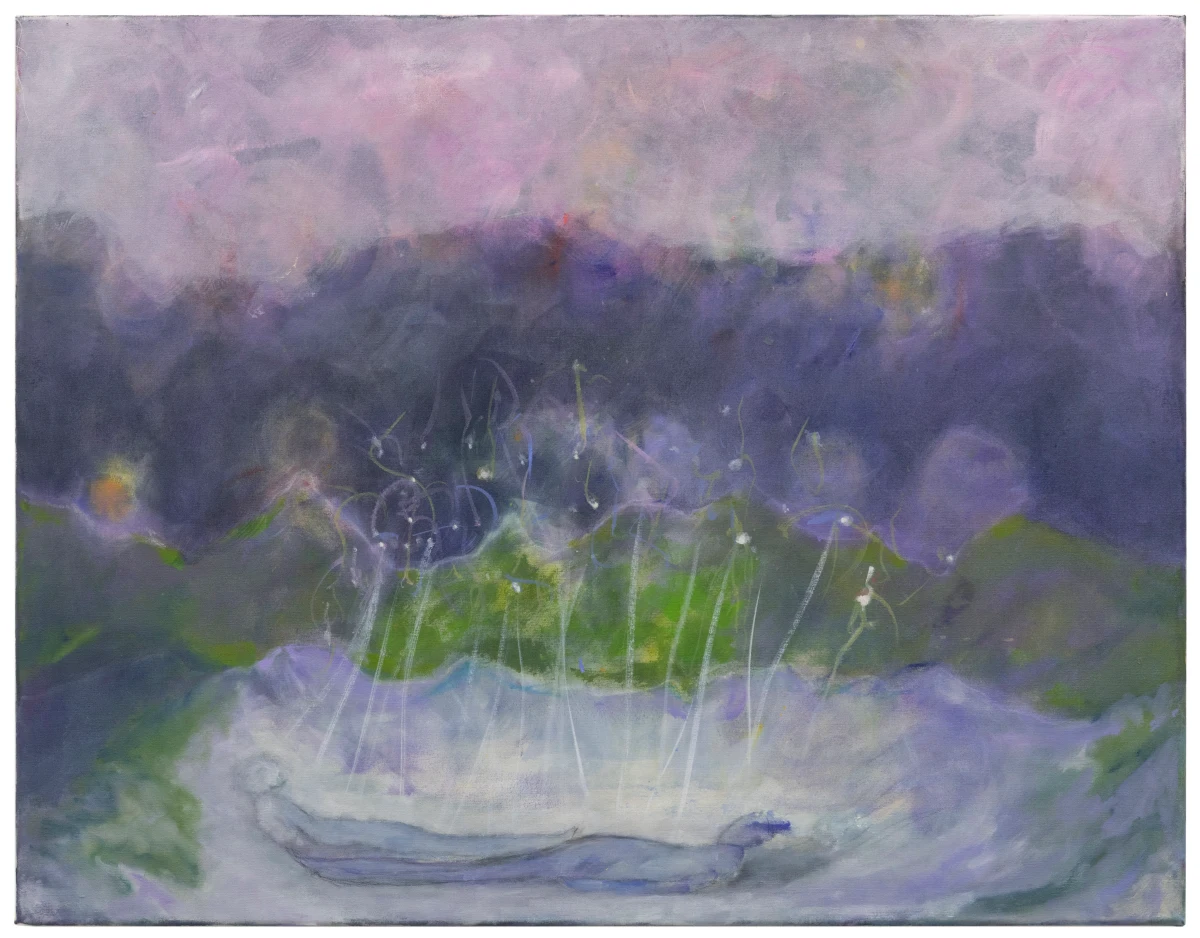 Favre evokes another form of transition and myth in Métamorphose, devenir étoile, while still drawing inspiration from Ovid’s Metamorphoses. Here, the transformation is no longer horizontal but vertical, as it depicts Callisto being elevated to the heavens by Jupiter. Hera, the jealous goddess, turns Diana’s nymph into a bear after discovering her husband’s infidelity. The divine lover barely manages to resolve the tragedy he himself has provoked—an occurrence familiar throughout myth. The mountains and the intense, vivid, almost biting hues in the background allude to the artist’s Helvetian origins.This moment of metamorphosis, that fleeting instant of transition from one state to another, is celebrated by the painter as an explosion of energy—a veritable fireworks display. The nature of her protagonists, as so often, remains fluid; it is precisely from this suspension that they draw a cosmic, radiant vitality.