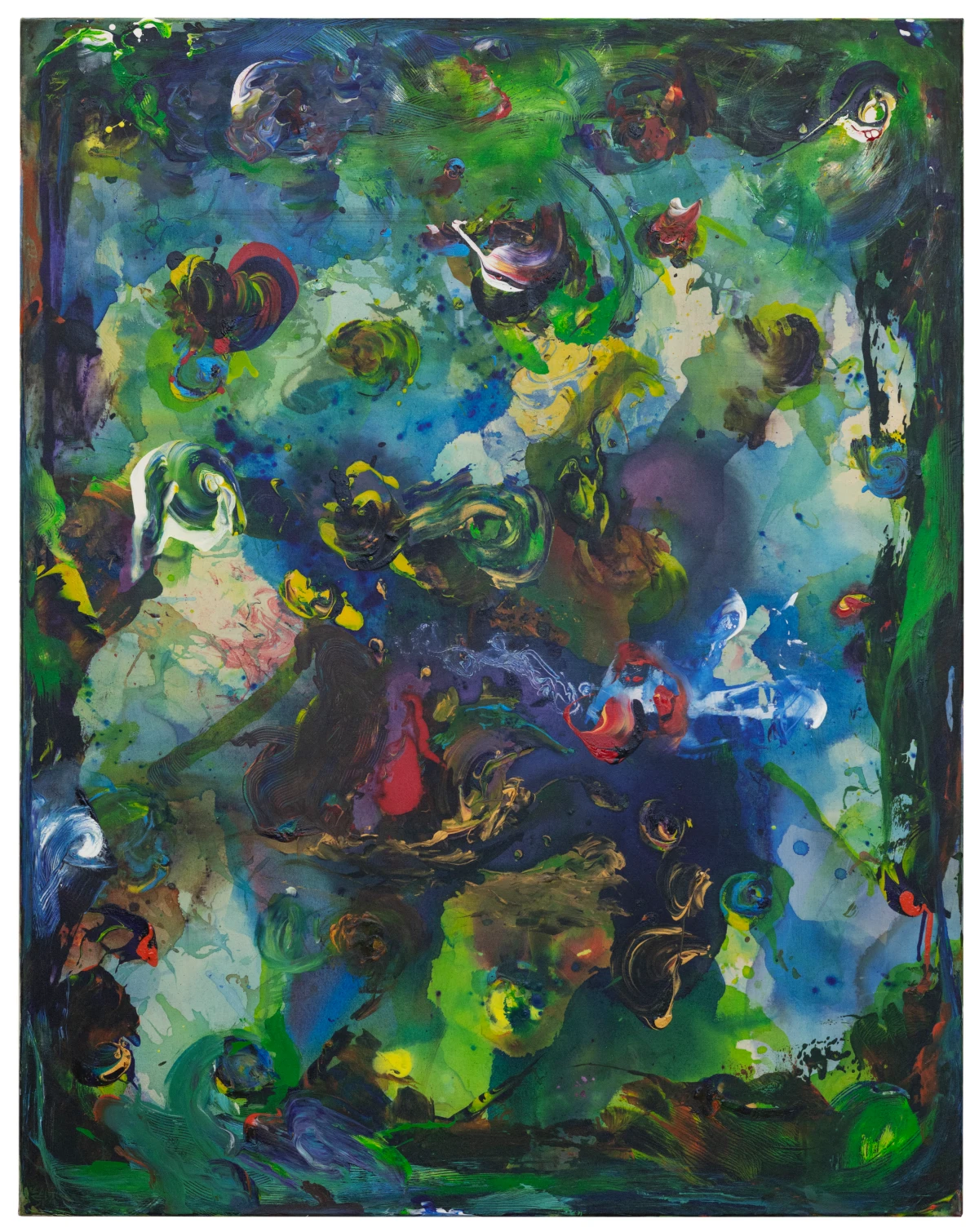 The work La cuillère (“Spoon”) brings together several of Favre’s iconic investigations. The boat assumes a central position in the composition, as in her series Le Bateau des Poètes—a homage to writers who glide from one shore to the other. The piece is inspired by an ancient Egyptian ritual in which deceased pharaohs were offered a spoonful of honey after embalming, to grant them strength and courage for their final journey. The nectar, in Greek mythology the food of the gods, here is presented by a dog, who—like a human—sits at the edge of a camp. This, of course, recalls the notion of “becoming-animal” (G. Deleuze), which Favre regularly explores. A whole bestiary invites the painter and makes tangible that the modes of existence of her protagonists are in no way determined by fate. Often captured in a moment of metamorphosis, her figures carry multiple potentials, incarnating themselves through the ongoing process of painting. Nothing is tamed in this work; for Favre, the beginning or end of time can only be rendered in a kind of ecstasy of matter. One thinks of Pygmalion—what literature-inspired artist would not claim similar intentions—and one delights in the fact that he dips his hands into the clay to enable her birth. Favre, in turn, immerses herself decisively in color; she experiments with openness, allowing the surface to vanish beneath the richness of layers—beneath the multitude of worlds. The audience is left with nothing but to approach her work almost like archaeologists, uncovering layer by layer a fractured sky of infinite colors, stars, and destinies.