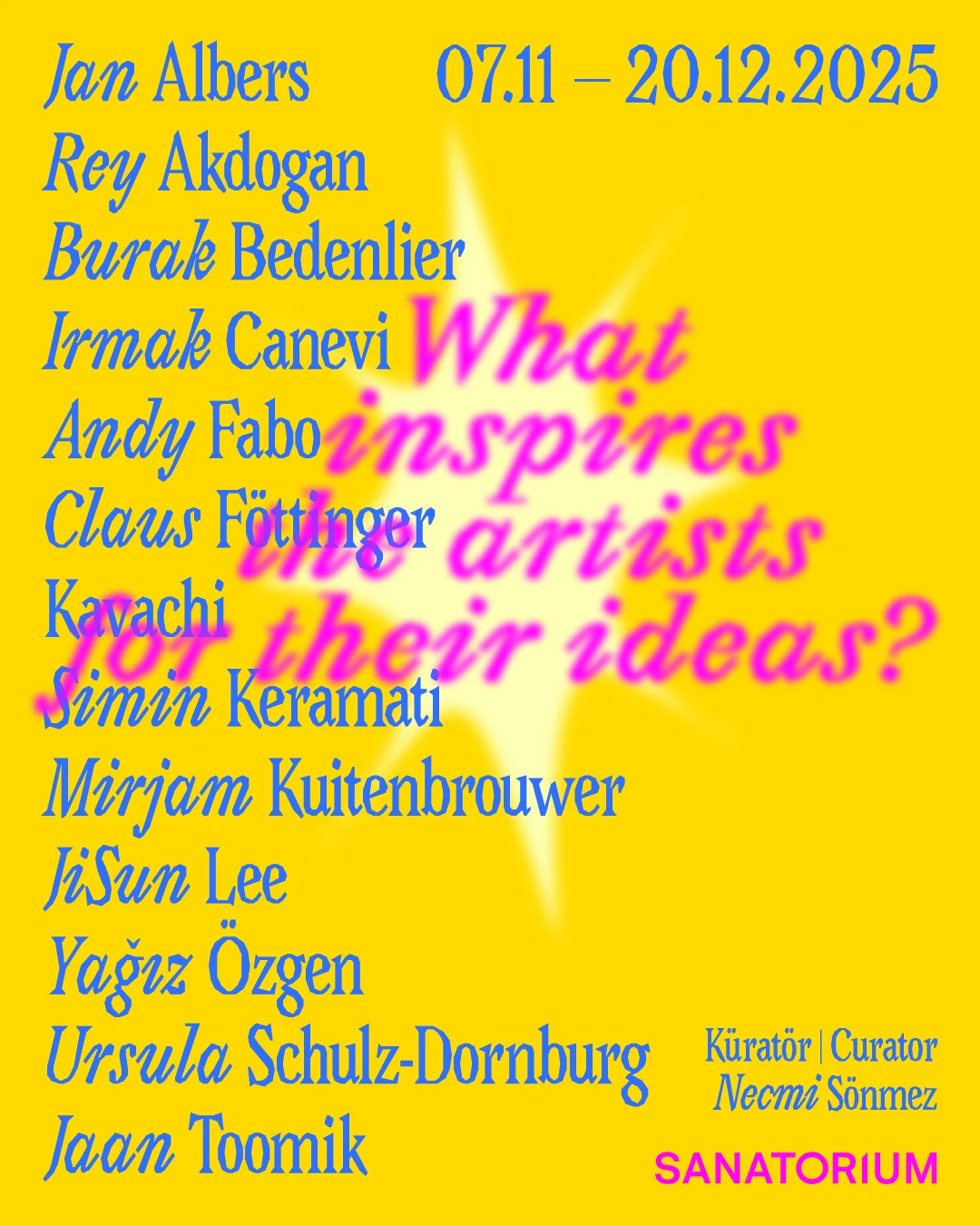 SANATORIUM presents "What inspires the artists for their ideas?", a group exhibition curated by Necmi Sönmez. Featuring works by Jan Albers, Rey Akdogan, Burak Bedenlier, Irmak Canevi, Andy Fabo, Claus Föttinger, Kavachi, Simin Keramati, Mirjam Kuitenbrouwer, JiSun Lee, Yağız Özgen, Ursula Schulz-Dornburg and Jaan Toomik, the exhibition explores the conditions and influences that shape artistic production.